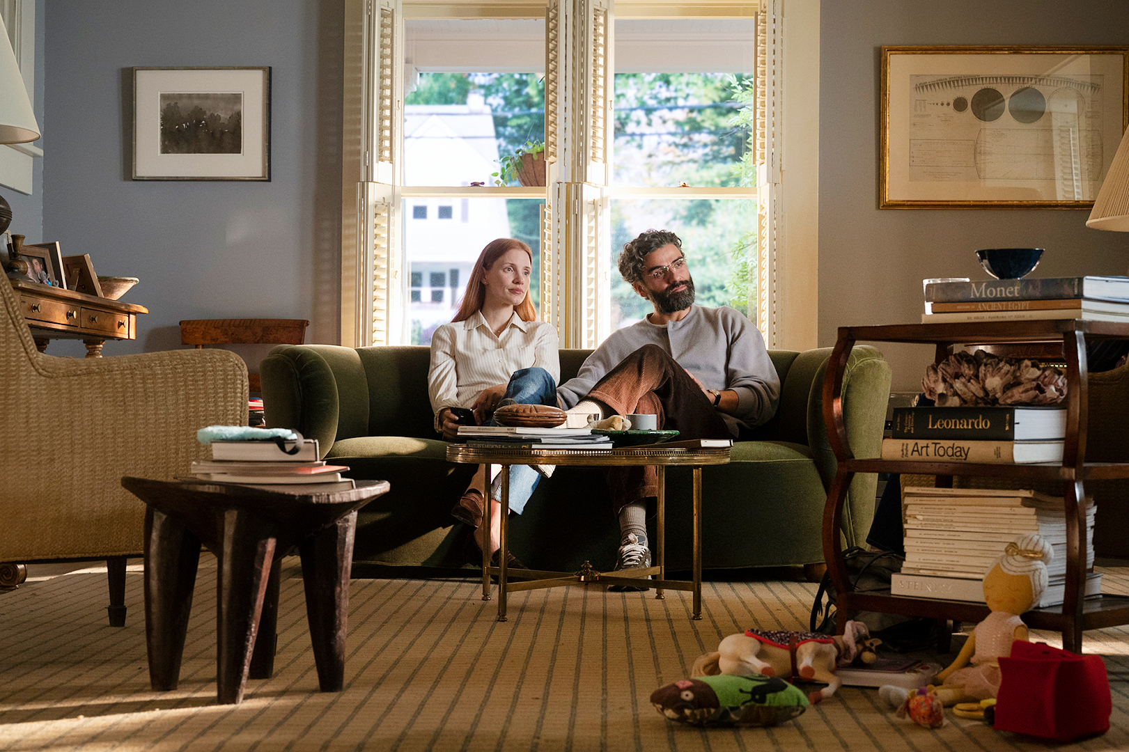 Green is having a moment, and not just on walls The color also stars in HBO’s Scenes From a Marriage in the form of a velvet sofa. Stephanie Bowen, the set decorator, dressed Oscar Isaac and Jessica Chastain’s fictional living room with a rounded love seat in an olive upholstery.