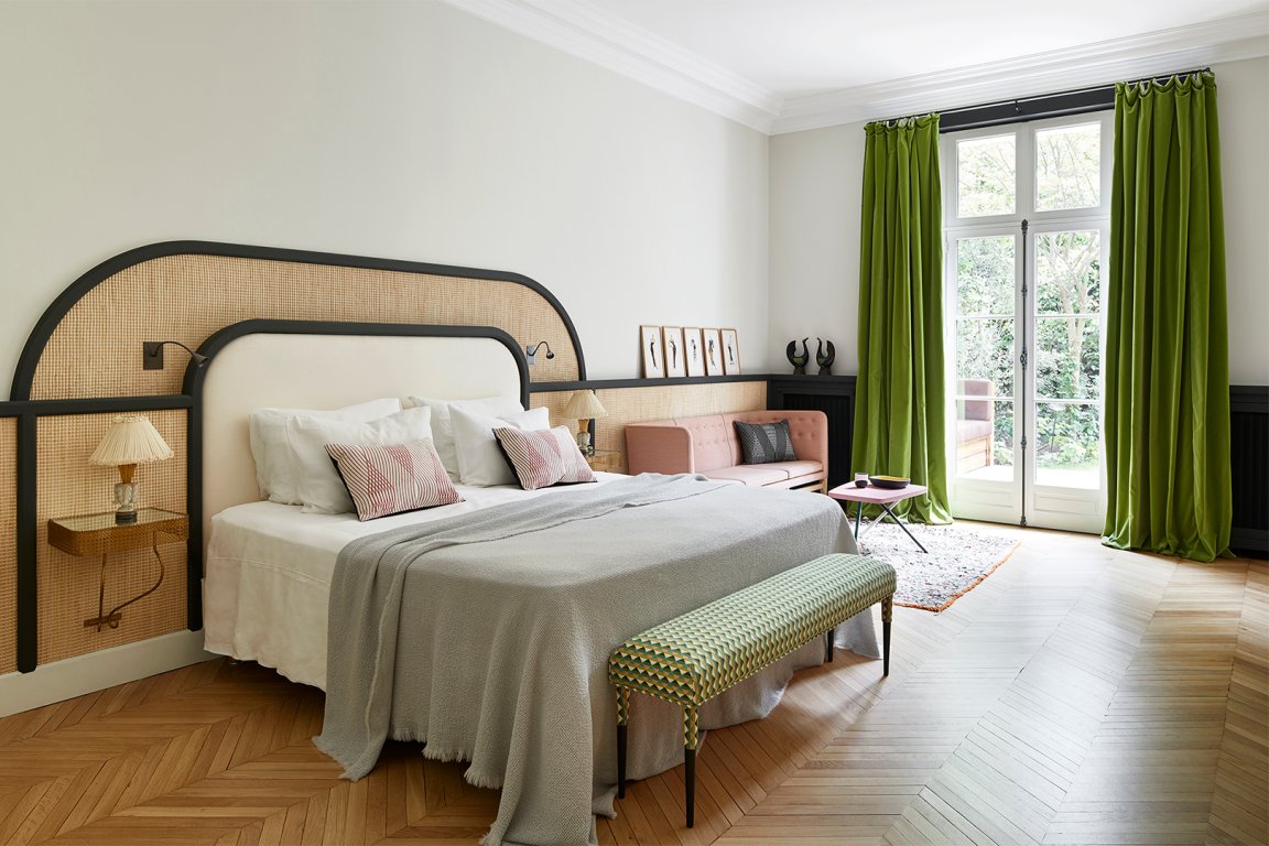 This eclectic yet streamlined Parisian space by Maison Sarah Lavoine uses a full-wall headboard to make an otherwise simple bedroom look tailored. Small sconces perfect for late-night reading are a practical detail, while quaint table lamps serve a more decorative purpose on the bed’s built-in shelves.