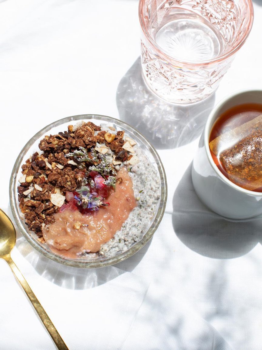 “Our cult-favorite dark chocolate granola is chock-full of nutrients—and it’s seriously addicting,” says Tingle. “First, we take selenium-rich Brazil nuts (an important mineral for hormone balancing), add cacao for a dose of antioxidants, and mix in ashwagandha. This adaptogen is known for nourishing and healing the adrenal system, which controls our stress response.” The two suggest adding two generous handfuls to your overnight oats.