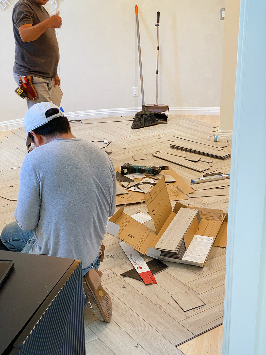 Lei watched the crew cut the new flooring to fit the curve of the wall. Their solution? Cut out a cardboard template first and use that as a guide for the saw. “I would have approached that the wrong way,” he says. “One of my fears was spending more time and money fixing mistakes versus just having someone do it the correct way the first time.” Crisis averted.