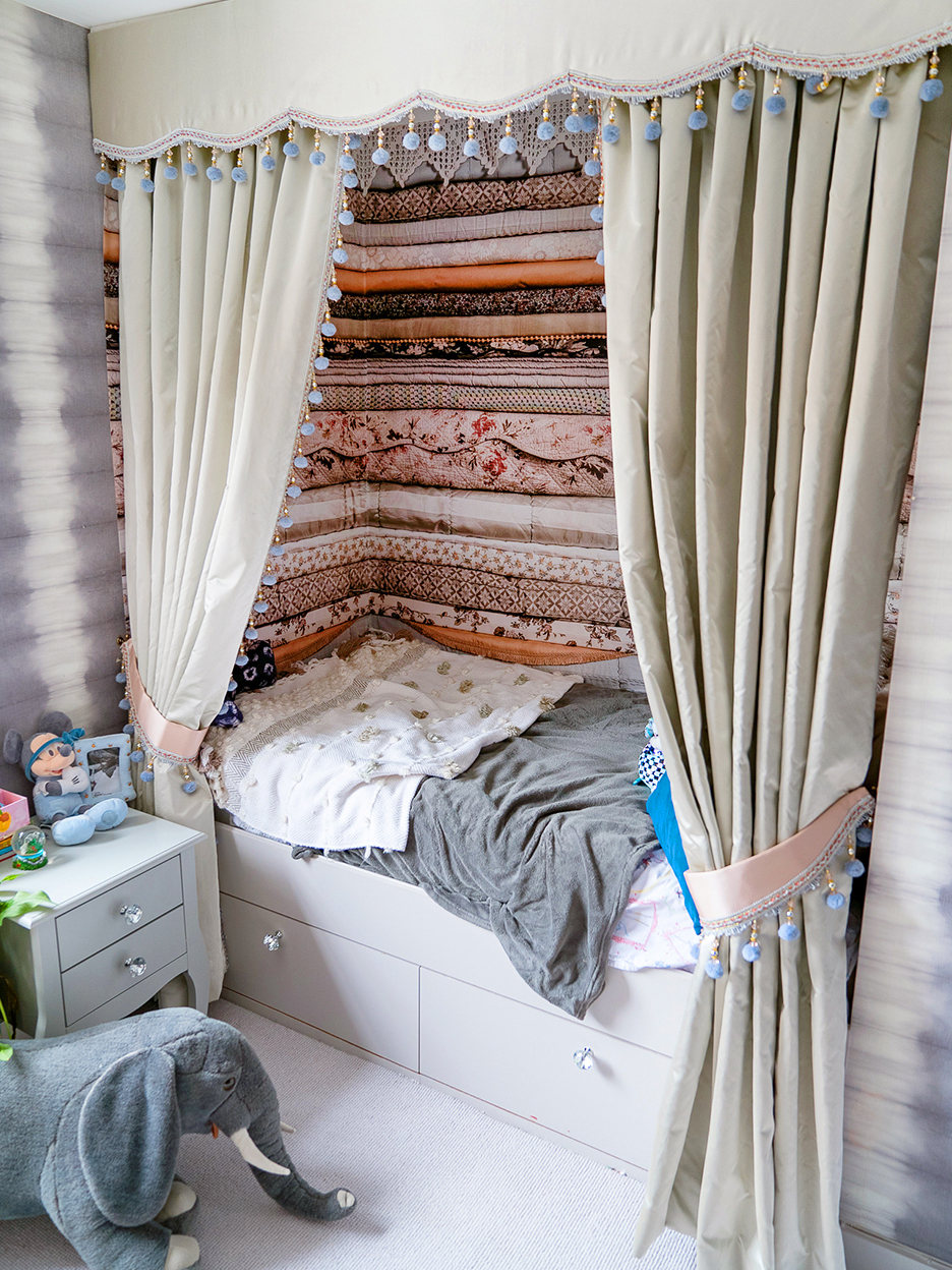 Lawson let each of her daughters choose their bedroom’s color scheme, hoping to bring them into the design process—“and so I could spearhead the rest myself,” she adds, laughing. Still, she referred back to them with each decor choice she made. “When we moved into this property, I was inspired by stately British homes—they all have these beautiful canopies, and I started thinking about how I could bring that look into my little baker’s cottage. My husband doesn’t necessarily want swishy curtains in our room, but the girls’ rooms? That was where I could really go to town,” says Lawson.