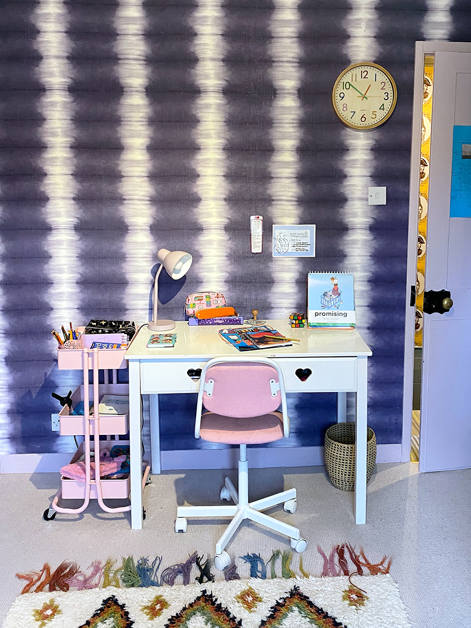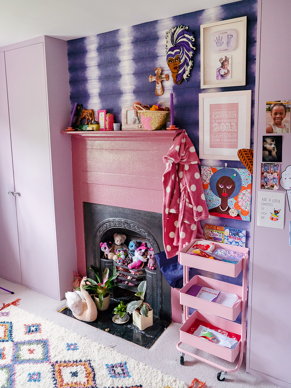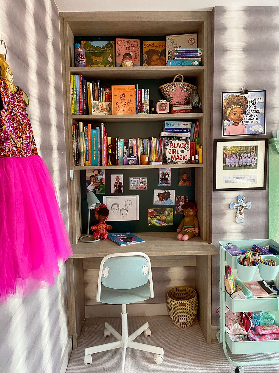 The wallpaper in both bedrooms makes a cool statement—and was also a meaningful gesture. Resembling Adire, a traditional African tie-dye–style technique that originated in Nigeria more than 600 years ago, the textural treatment gives the walls extra warmth. “It’s very resonant of our heritage and like a part of our DNA,” Lawson says of the print. “When I put it up, I could feel that energy in the room.” Similarly, each piece that she brought in became a way of forming (and affirming) the girls’ identities. “I want the feeling of recognizing themselves in the art on our walls to be normal,” she explains. “If they’re thinking of a great classical composer, I want them to think of Samuel Coleridge-Taylor as much as Mozart.” as much as Mozart.” The bookshelves are also lined with empowering reading material (“I try to face the book covers outward, especially ones that have positive messages of Black girlhood,” says Lawson)—and pictures and mementos from family and friends are proudly displayed throughout the home. Ultimately, she says, surrounding her daughters with special things was her way to “express my love for them.”