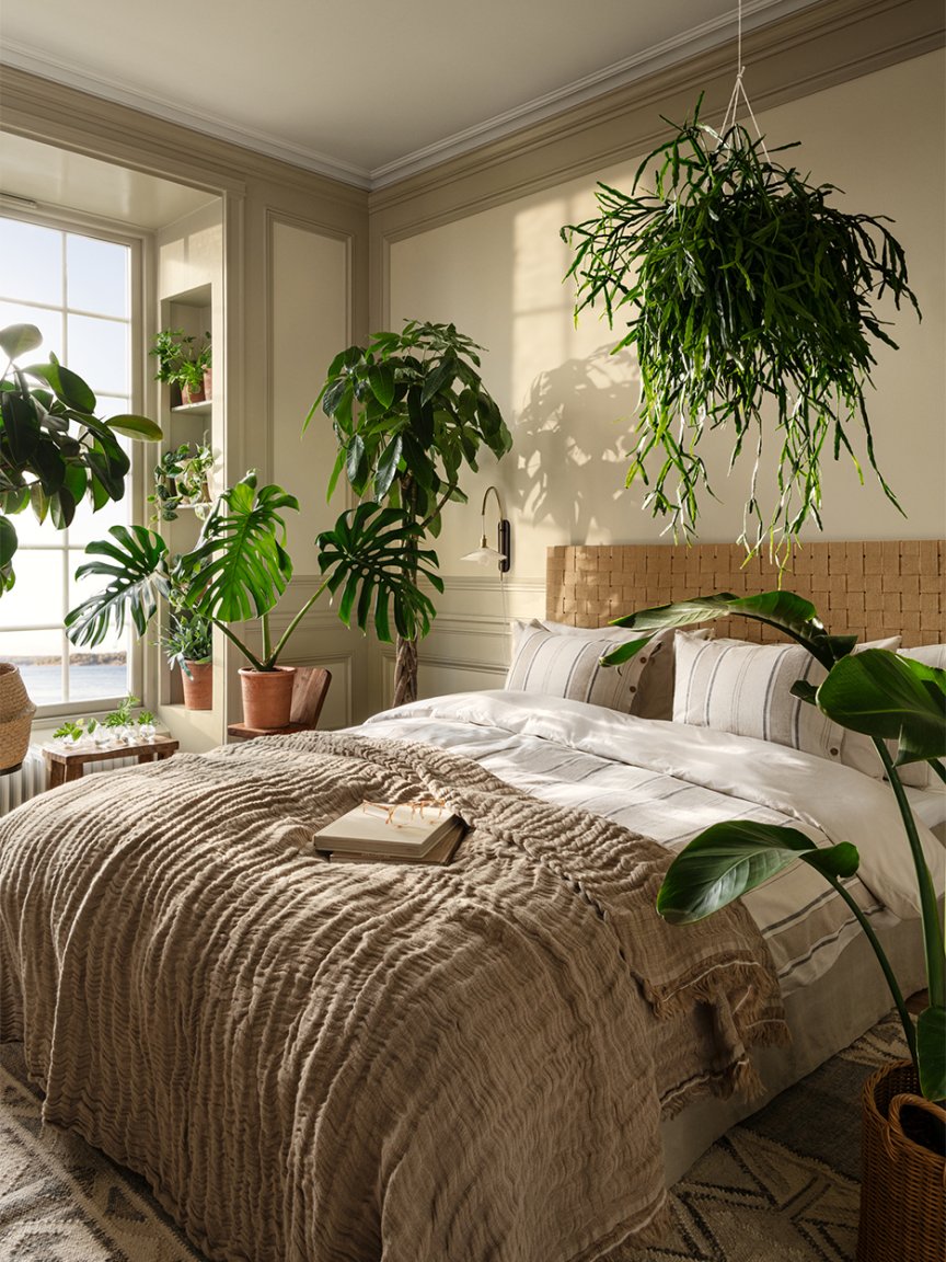 A rattan pot sets a relaxed vibe that goes great with other natural materials like linen and unfinished wood.