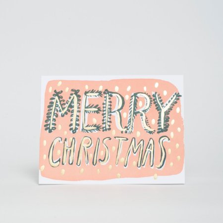 An updated take on the traditional Christmas palette with shades of blush pink and mint green in the mix. A metallic gold-foil message gives it the right dose of holiday flare.