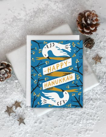 This illustrated card, based on a hand-painted original, depicts white doves—a symbol of peace—along with wishes for a happy Hanukkah.