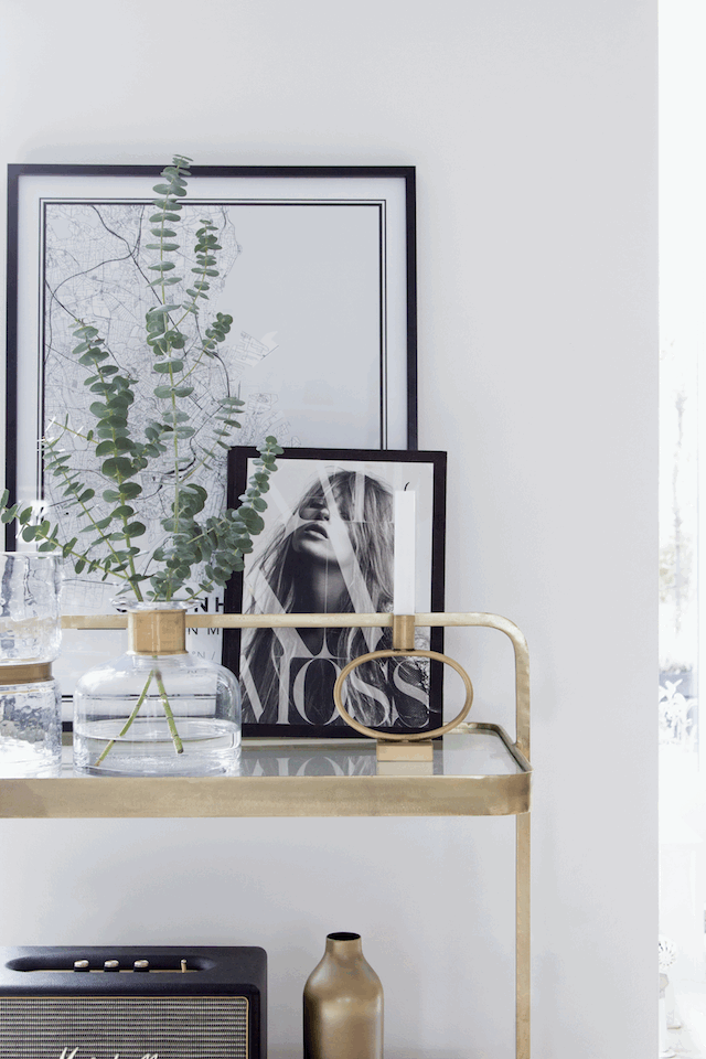 You don’t need to do an entire home overhaul to get in the holiday spirit. Leave it to Niki Brantmark of My Scandinavian Home to remind us that no bar cart should be left untouched. The design blogger’s setup got a quick refresh with brass vessels and candlesticks, winter-themed artwork, and eucalyptus branches.