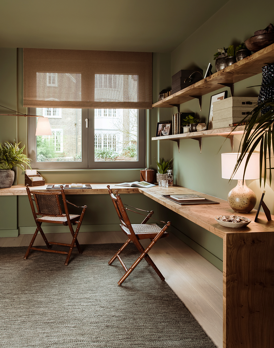 Like a good novel, a good space starts with the characters. “This is where we pictured Ernest Hemingway writing his books in Cuba,” says Camilla Clarke, one of the interior designers at London-based firm Albion Nord, of a narrow, moss green office the team recently designed for 80 Holland Park, a series of newly built luxury residences in the city. While you’d expect all the apartments in a large-scale development like this to look the same, Albion Nord took a fresh approach: Each of the 18 out of 25 homes they’ve completed so far are meant to feel totally different from one another. So it helps to have a specific vision (or person) in mind when picking out wall treatments and furniture, say a famous author who could be found writing at a pippy oak wood desk and sitting in a vintage bamboo folding chair.