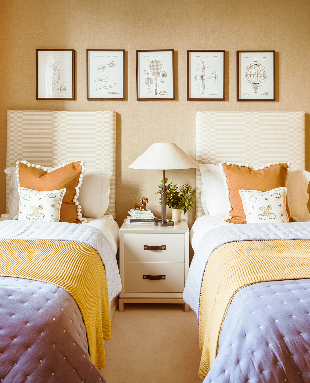 When it came to choosing palettes for the bedrooms, soft blues, creams, and light greens were the go-tos, but the designers tested out unconventional hues like orange and loved the results. “It’s a really nice color,” notes Clarke. (Peep it in a bedroom with twin beds that was designed with an imaginary young family in mind.) “In the evening, it takes on a different personality than it does in the morning light. I think you can be brave with bold colors and pair them against fresh white sheets. It’s always going to look quite sharp.”
