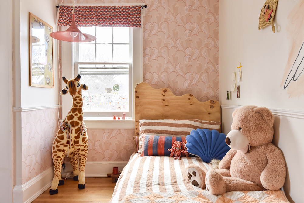 Lake takes comfort in knowing that her namesake mural always looks over her. “It represents her spirit animal and the maternal lineage of my mom, and watches over her so she doesn’t have bad dreams,” says Velten-Lattrell. The designer’s initial exchanges always touch on fears and coming up with solutions to overcome them. “I did a pair of twins’ rooms who expressed that they were nervous to be apart,” remembers Velten-Lattrell, who hung vintage door knockers on their shared wall for them to interact via a secret code. “Now they have this twin communication station.”