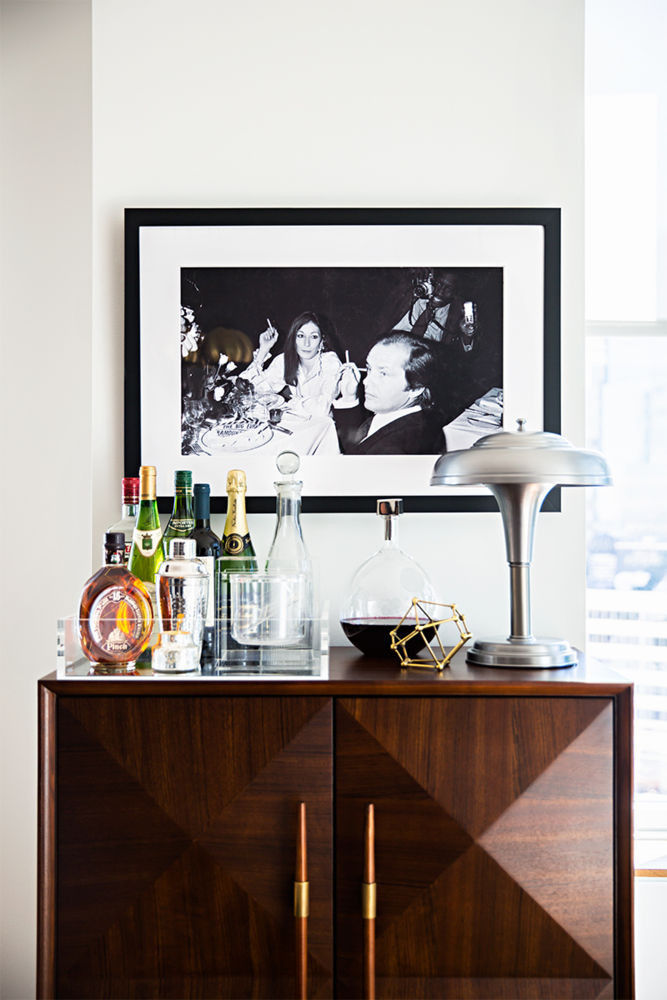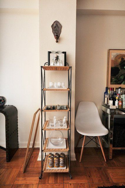 Also making good use of vertical space, we love this narrow shelving unit and its ability to serve a crowd without crowding the crowd. If you have room for two, we’d set up two mini bars on opposite sides of the party space.