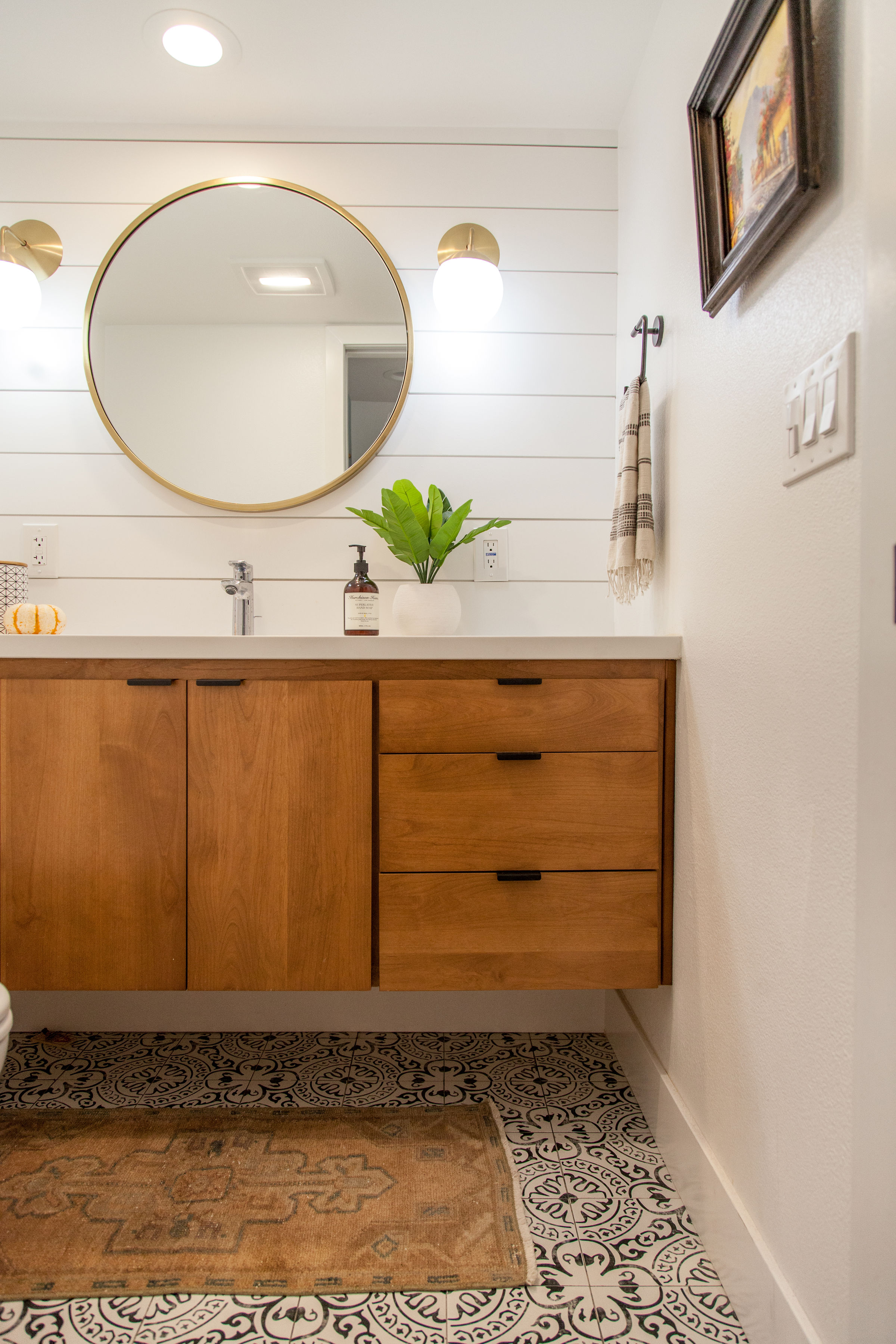 Mochizuki’s husband did everything he could to save money on construction costs, which included demolishing their ’70s-style fireplace mantel, installing recessed lighting in the living room, building the subfloor upstairs, and adding shelving to the master closet. They estimate it saved them around $30,000 in labor expenses. That’s not to say their DIY journey wasn’t without its setbacks and surprises (several hours after kicking off demo day, Mochizuki’s husband was rushed to the ER with appendicitis). “This happened three days before we needed to pack up the rest of our home,” recalls Mochizuki. “Talk about a crazy weekend.”