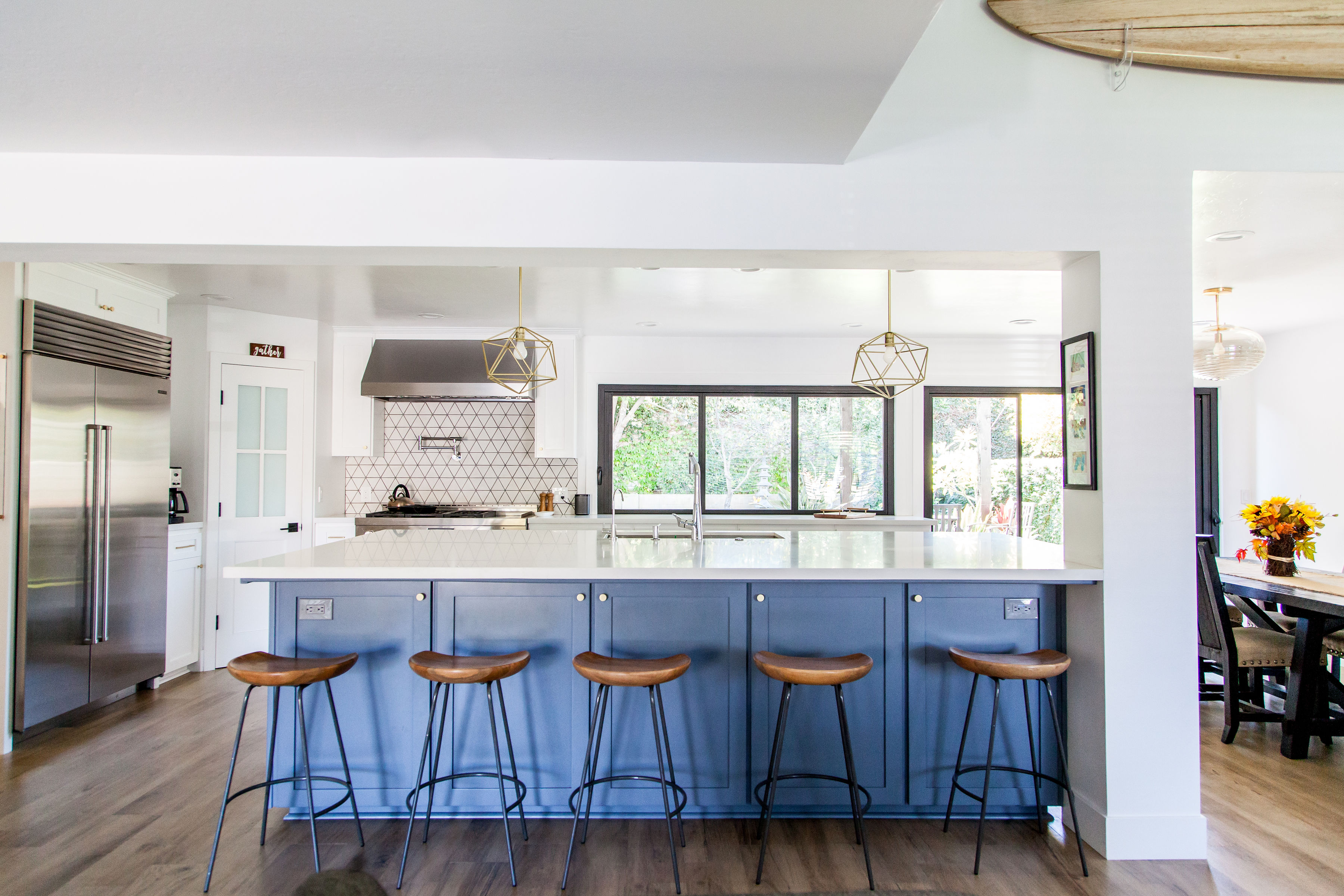 The biggest items the pair splurged on were the oven and the accordion windows and doors—additions that make a difference in their day-to-day, especially in the summer when they’re spending time outside and hosting parties. Now that the family hardly dines out, having a spacious 48-inch Sub-Zero refrigerator that could meet all their leftover needs (and keep produce fresh) was crucial. “Strawberries can last at least a week in the fridge without mold. The amount of food going to waste has gone down considerably,” she says.