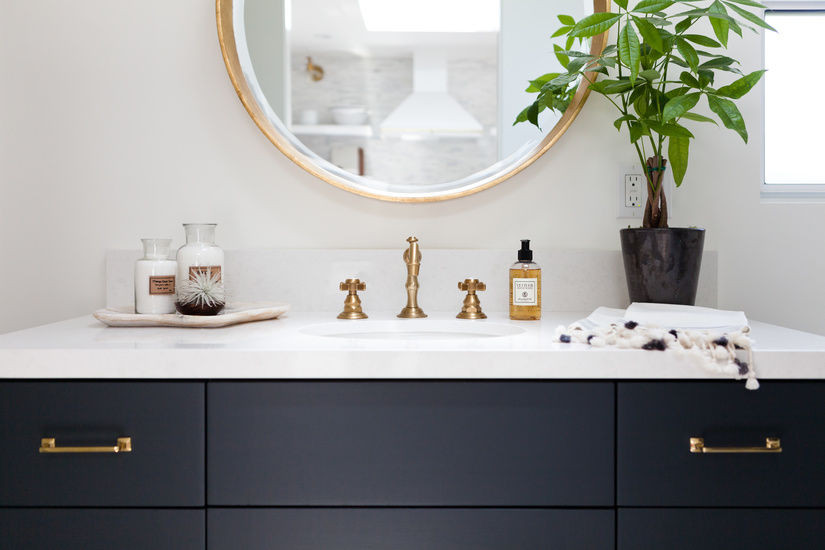 - Dress up the sink surround with dainty accents and upgrade the cabinets with a sleek set of hardware.