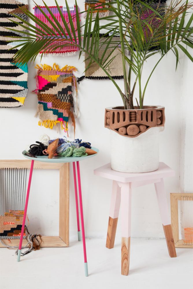 - Prop a pair of compact stools aside the bath and top with a bevy of scented products and soft textiles.