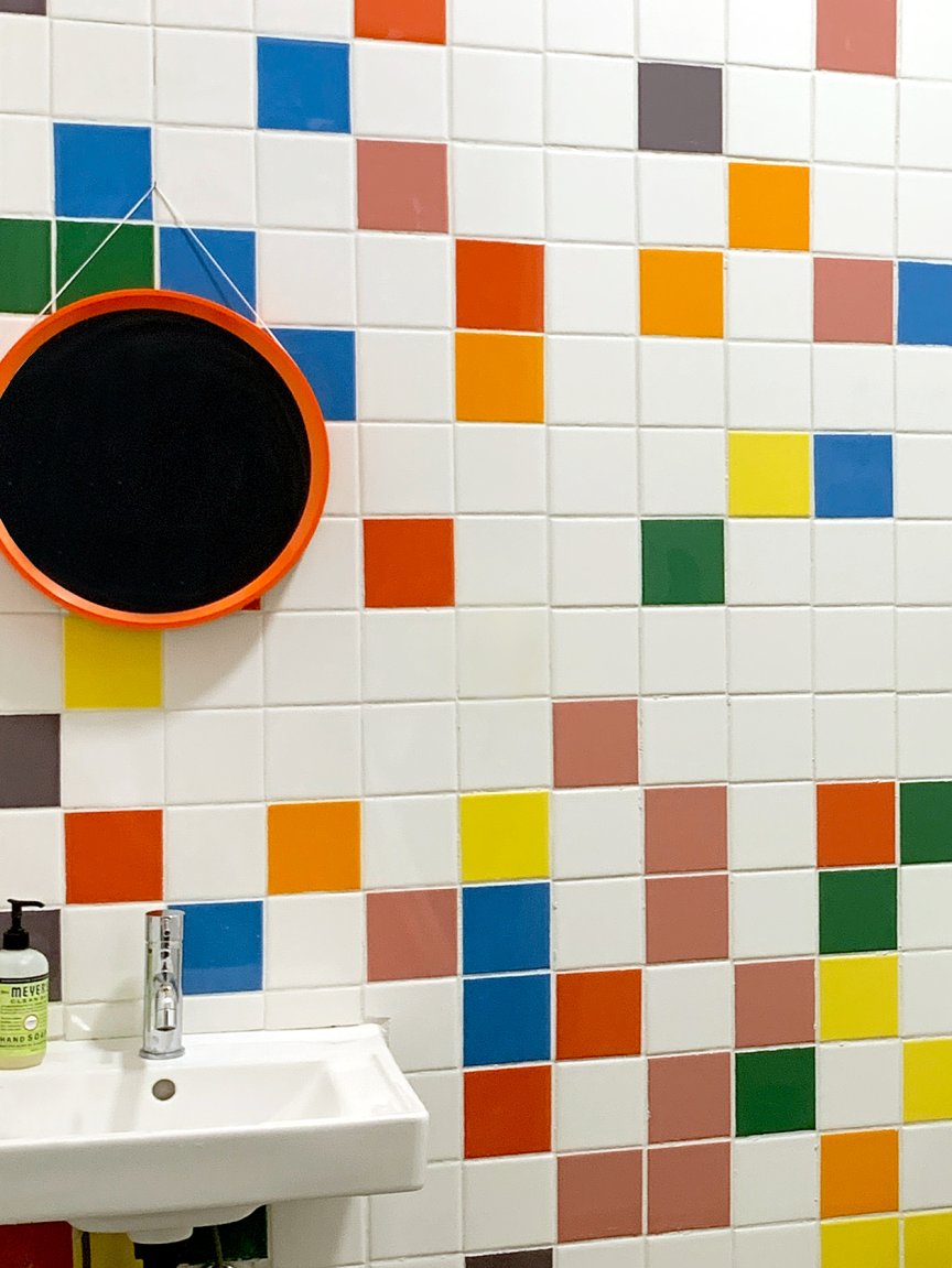 As they prepare for the opening of a new Brooklyn store in February, they’ve tackled another mini project that stopped us dead in our tracks: covering the bathroom walls in a rainbow of simple ceramic tiles. “We had a ton left over from our old store and wanted to spruce up our generic bathroom with some bold color that would be memorable to anyone who goes in,” explains Lavery. “Because it’s a small space, it’s the perfect place to be extreme. It’s great for selfies, too.”