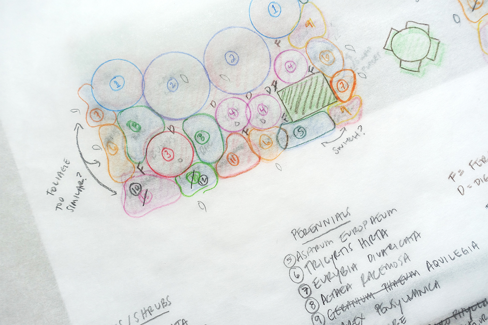 Once these zones are planned out, I begin layering in specific species from my list on another layer of tracing paper, considering height, form and color combinations as I go. For me, the most dynamic spaces are a study in contrasts, so I always try to break up repetitive spherical shapes with a strong vertical statement, shake up the use of polite pastels by incorporating flowers with a pitch-black or clownish hue, and experiment with drastic changes in scale. Typically this takes me several passes before I arrive at a solid end result that has multi-season interest, is cohesive without being redundant, and has a few unexpected touches. If you have the luxury of putting your plan in a drawer for a week to let it simmer, I suggest you do.