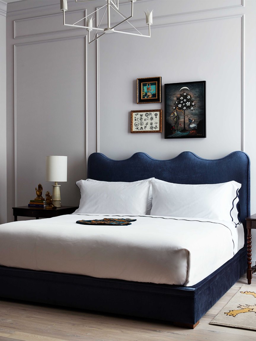 What makes a hotel bed a hotel bed? For many, says Klymson, it’s the signature all-white color scheme—but that doesn’t mean it has to look stark.