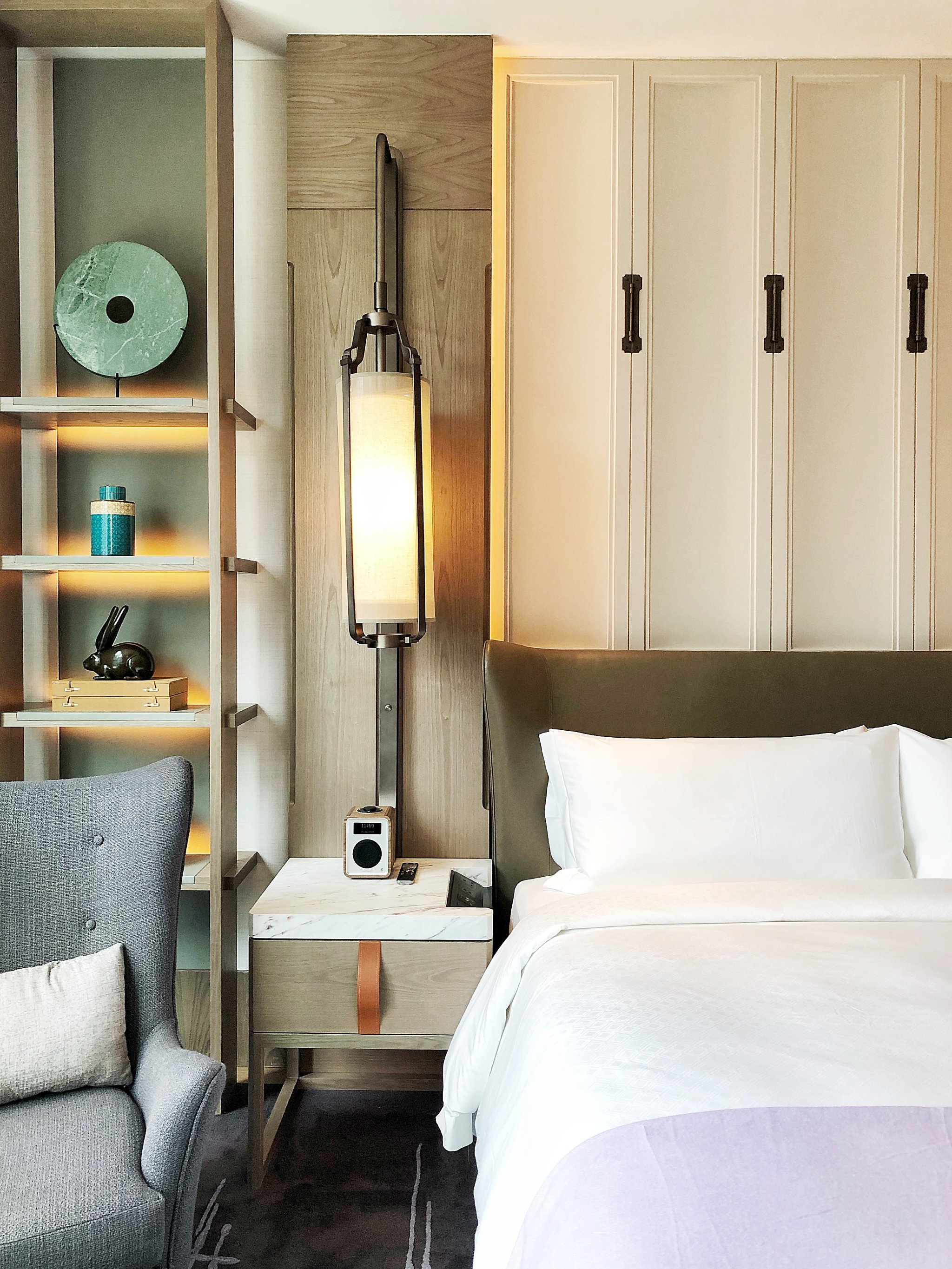 Poetic the hotel is! Grand but intimate spaces are lined in rich, jade-hued marble and 1920s-inspired lighting—a nod to Hong Kong’s past and the original St. Regis in New York. Being the design nerd I am, naturally I had to quiz Fu on his best bedroom decorating tips from all his years in the business. Here are our five favorites: