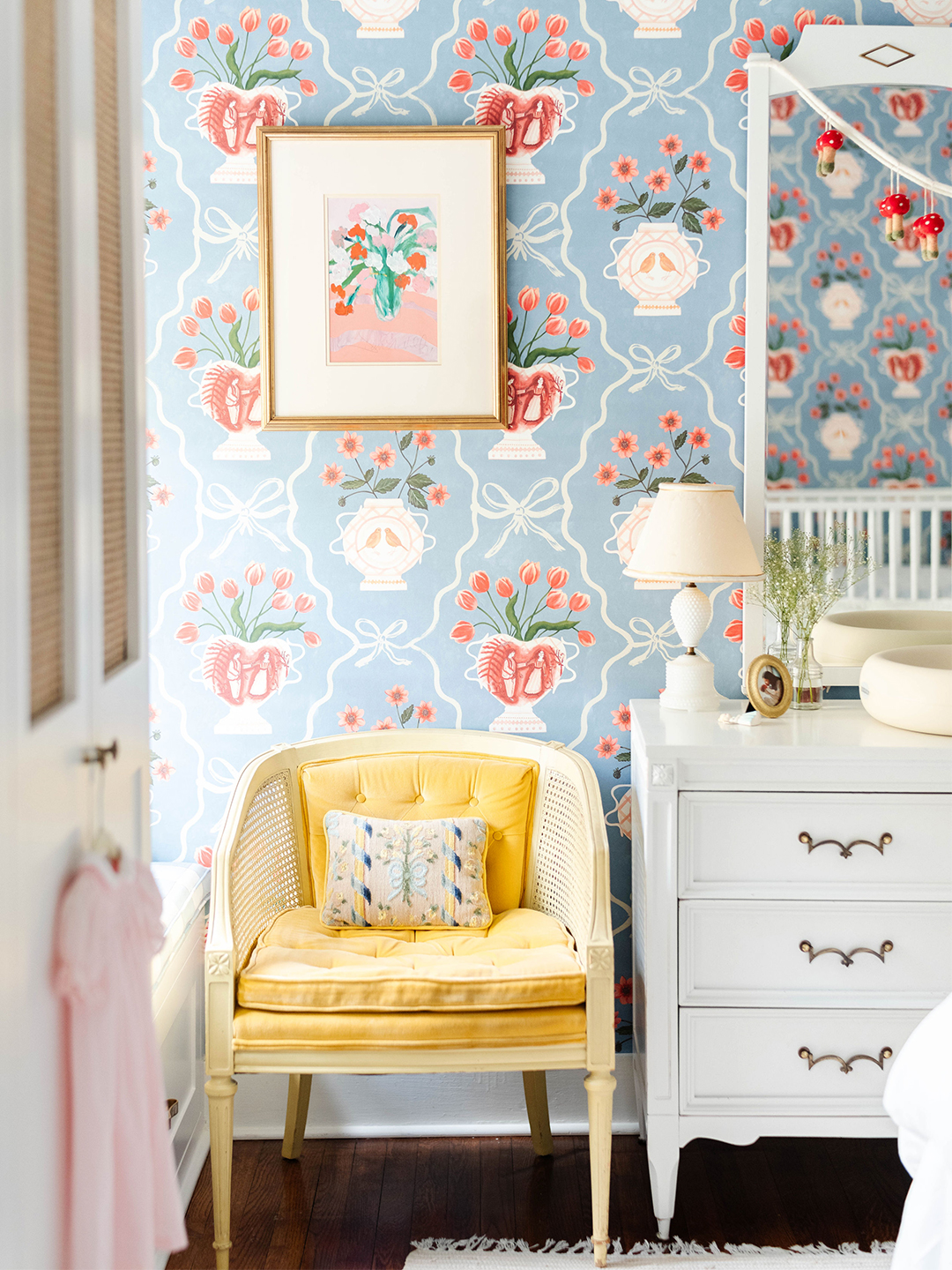Walls lined with antique plates, lampshades with scalloped edges, and gingham-patterned pillows are a few of the reasons we’ve all become obsessed with British interiors over the past two years. But for Anglo(design)phile Kathryn Humphries, it’s much simpler than that. “It’s the emphasis on things that are old,” suggests Humphries, the Houston-based cofounder of All You Need Method, an online course and consultancy platform for small-business owners. “They honor things that have been passed down.” That coveted lived-in feeling was what she sought to achieve when designing her now 10-month-old daughter Annie’s nursery, a space currently filled with vintage pieces and accessories that once belonged to Humphries’s grandmother (like a sunny yellow armchair) and small relics from when she lived in New York City.