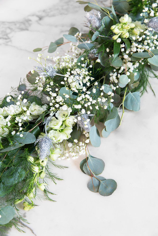 First, cut the stems of your florals and greenery to short, varied lengths. Next, lay out your materials so you can get a visual on what you have to work with. Finally, it’s time to arrange! Christy recommends starting with a base of greenery before filling in holes with florals. First time garland makers: Expect to spend one to two hours arranging, especially if it’s for a larger table. If you’re particular about placement or are choosing a more complicated design, like ombré, leave even more time. If you’re an expert at handling flowers, budget around 30 minutes.