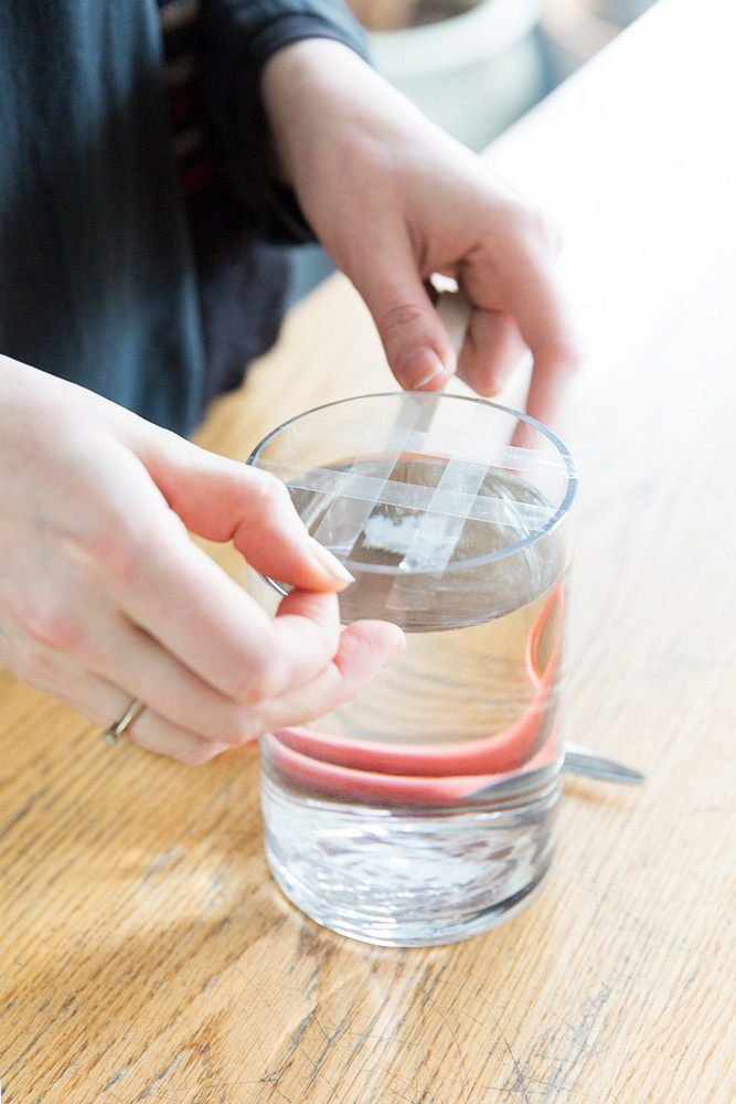 Begin with a standard vase and fill it with water, about 3/4 of the way up. Using a thin, clear floral tape, create a basic 3 x 3 grid. The cross section will allow you to easily set in the plants, without having to use floral foam, which can be harmful to the flowers.
