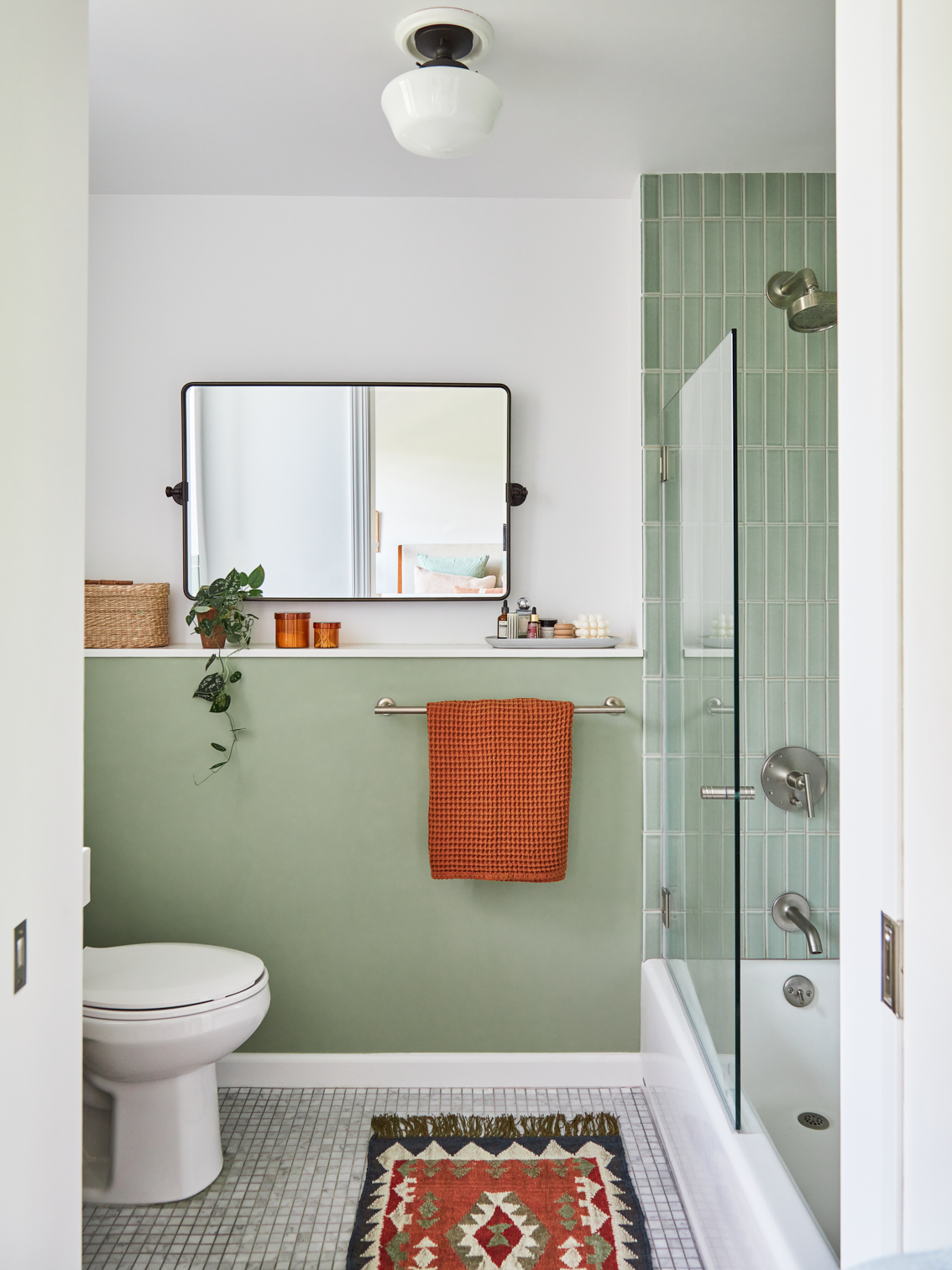 Haynes suggests applying either a mixture of white vinegar and dish soap or a paste of baking soda and water to the walls of the shower and tub, letting it sit for three minutes, and then scrubbing it away. Rinse with warm water to reveal your sparkly clean tile.