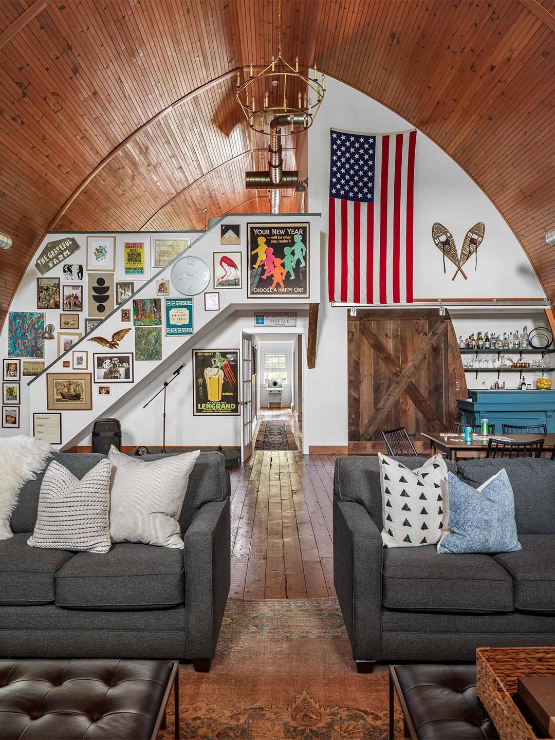Although the two will say all the genius finds were Paranjape’s doing, the designer begs to differ. One of her favorite elements is the collage wall in the massive 40-by-80-foot “party room,” where the tall arched ceilings provide a big blank canvas along the stairwell. “I love that they collected each piece from their travels or local antiquing and managed to create such a perfect reflection of their lives together,” says Paranjape. She stepped in to source the hard-to-find items: vintage rugs (“A splurge that doesn’t need to be babied—they are well constructed and beautiful already,” she notes), a custom dining table, and a bar crafted by contractors on Etsy. Facebook Marketplace provided the trio with an antique canoe that hangs in a guest bedroom that now sleeps four kids, bringing the home’s total capacity to an impressive 20. The secret to finding deals online is to know the dimensions you’re working with first, advises Paranjape: “Measure, measure, measure.”