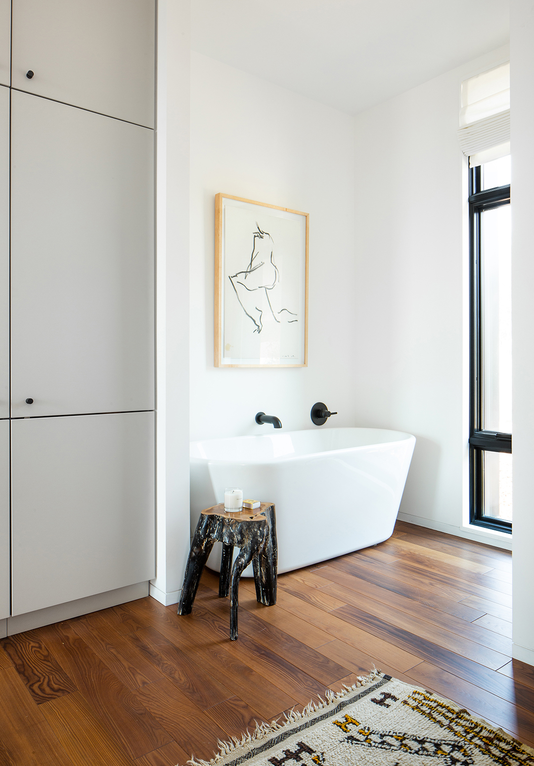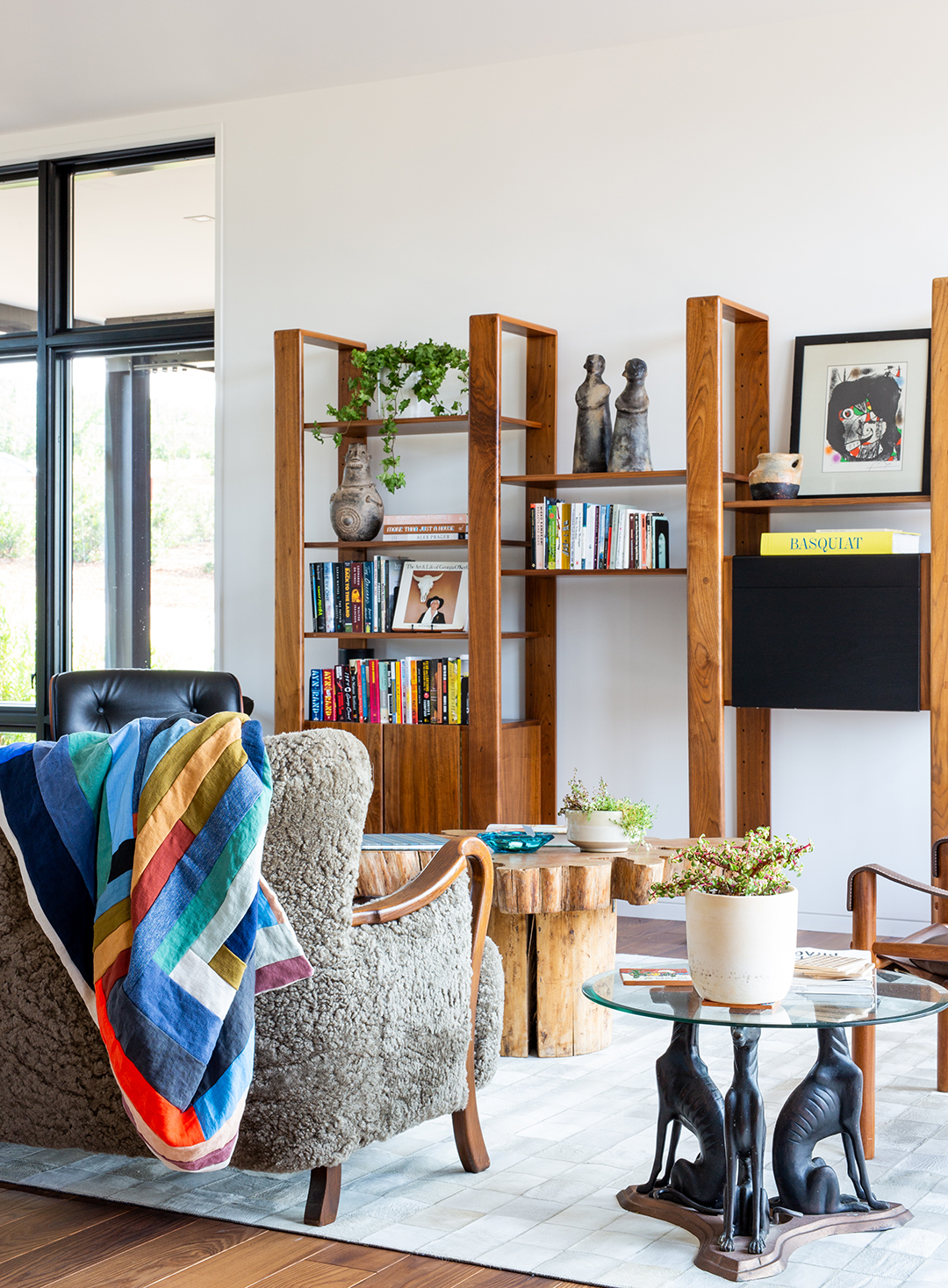 To start the transformation (of the land and of themselves), the empty nesters enlisted eco-conscious maker Hygge Supply to provide them a one-bedroom, two-bathroom shelter and a one-bedroom ADU that they use as a guesthouse (The pool is an old shipping container from Mod Pools.) For them, choosing a prefab home that they could order online was a no-brainer. “The finishes looked like what I would choose if I was starting from scratch myself—and I’m very picky,” Melissa says of the black exteriors and hardwood floors.