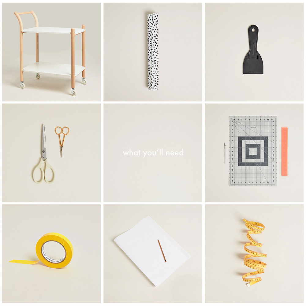 1. Choose your furniture and the area you wish to cover. If it’s a particular drawer or shelf (or, in the case of this specific project, two levels of the cart) you wish to cover, see if removing them is possible. It’s significantly easier to cover something that is not already attached to a larger structure.