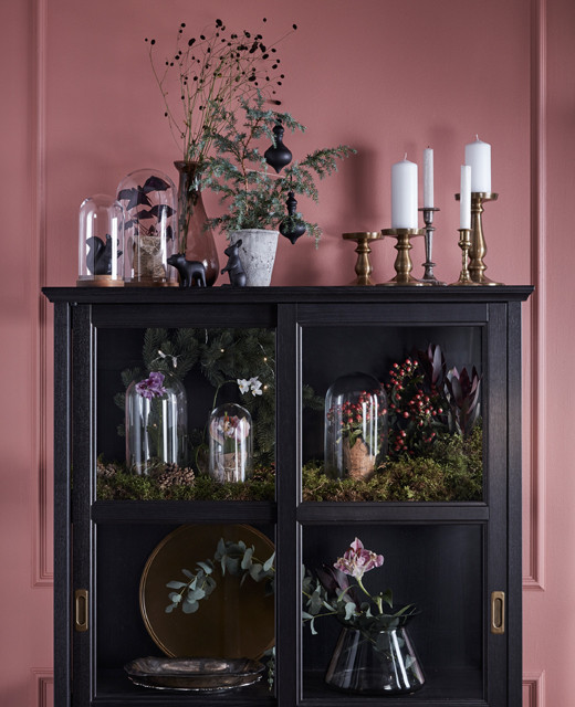 Consider glass-door cabinets as an excuse to put your most revered trinkets, decorative accents, and potted greens on display. A well-curated shelf goes without saying, while implementing a handful of lustrous pieces can help take the set to a new level. In this beautifully decorated scene, moss-lined shelves transform an ordinary shelving unit into a real show-stopper.
