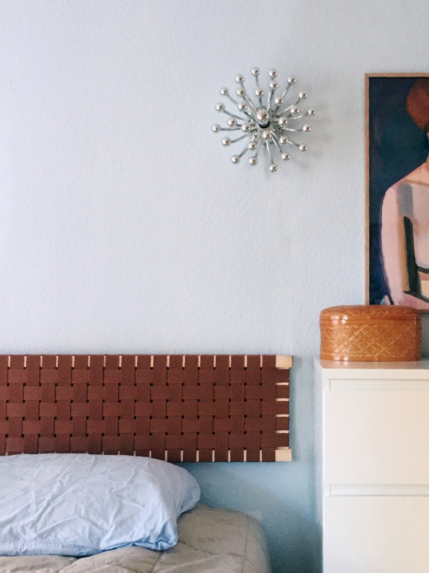 Lumberyards are hard to come by in Julie Katrine Andersen’s home city of Copenhagen. So when the seasoned crafter decided to make a floating headboard for her bedroom, she got creative with a wood frame from IKEA’s Ivar bookcase. Drawing on her Finnish heritage, Andersen took inspiration from Alvar Aalto’s iconic 611 chairs and wove nylon webbing around the structure. “I wonder if Mr. Aalto will turn over in his grave,” she says. “I hope not.”