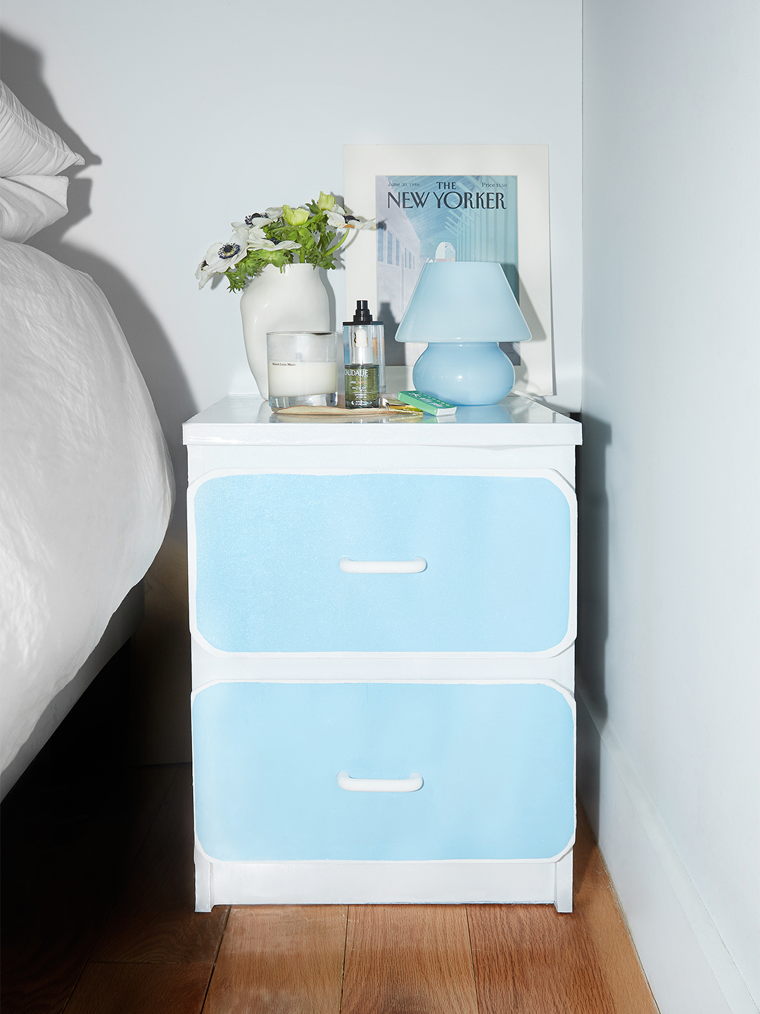 When Overice founder Meijun Li spotted a vintage blue and white nightstand at Bi-Rite Studio in Brooklyn, she thought she had found the perfect piece to reinvigorate her bedroom corner—her least favorite part of her downtown Manhattan apartment. But it turned out it was too wide for her space. However, Li wasn’t disappointed for very long. “One day I came home and thought, Why not just make over the one I already have?” she recalls.