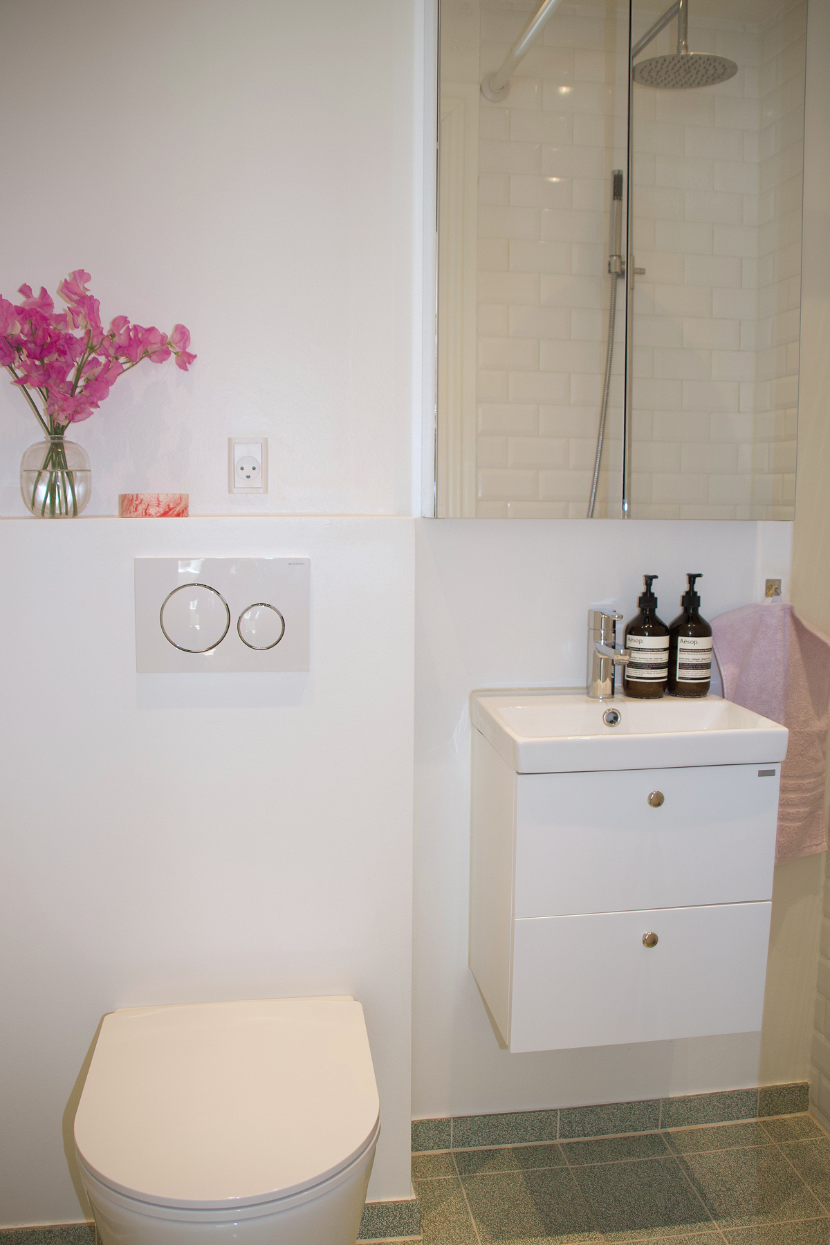 The building Thorgaard moved into has a shared bathroom in the basement, which is how the previous owner got away without having one in the apartment. Making room for one, however, was a nonnegotiable, and Thorgaard made sure there was enough space for a standing shower, toilet, and floating sink (with two drawers underneath). She clearly has a soft spot for tile. “It has a Parisian vibe that fits with the rest of the apartment,” she notes.