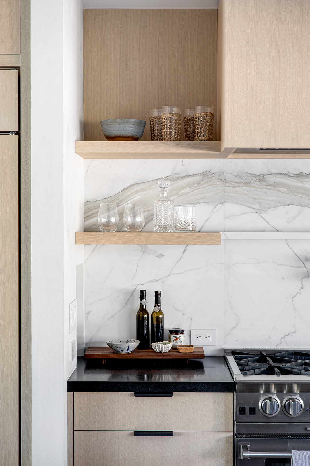 Next to the paneled refrigerator is an entire walk-in pantry, discreetly hidden behind a matching oakwood door. Originally, the 6-foot-deep bump-out was intended to disguise the exterior HVAC equipment from the view of the street, and so the designer took advantage of it with a workhorse of a space: There is a sink, wine storage, and a coffee maker there. “It lets the main kitchen be a little less busy and cluttered,” she says. It’s the second coolest party trick in the room.
