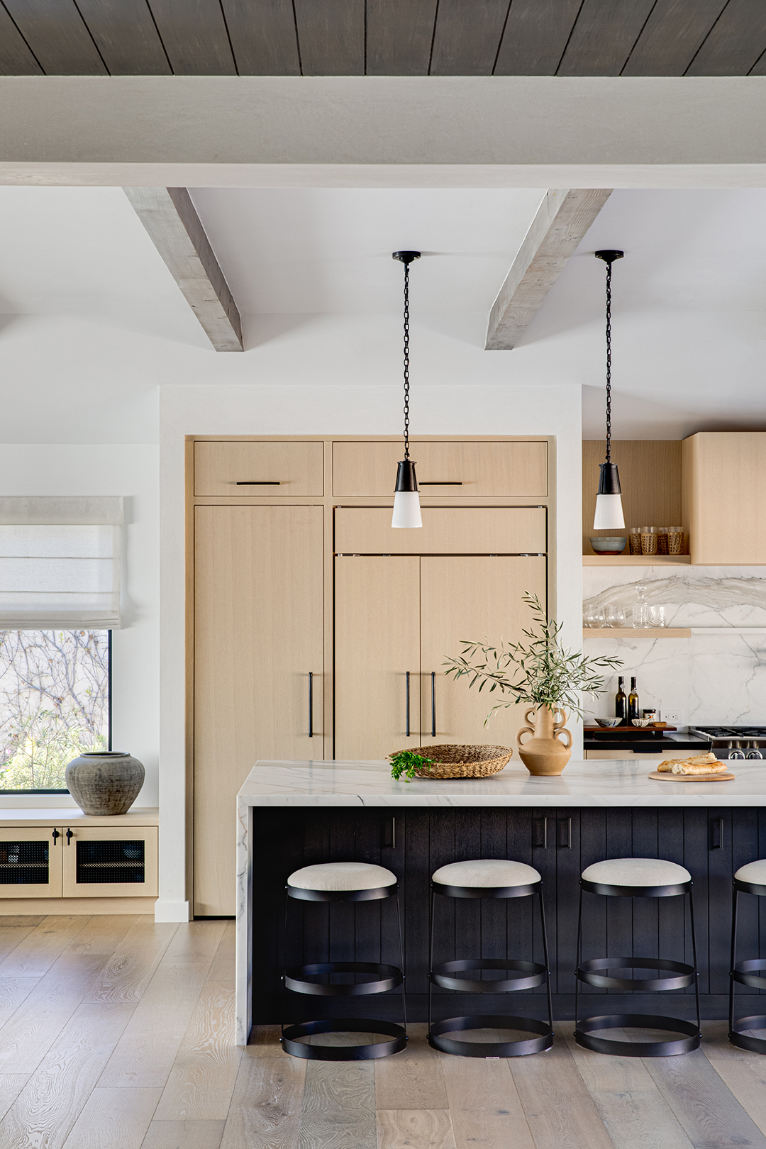 Of course, inside the house, Smith was able to prioritize aesthetically pleasing materials over weatherproof ones. Cue the oak cabinetry (the island base is ebonized) and the Calacatta marble backsplash and countertop. Open shelves on either side of the range hood offer an opportunity to display the family’s collection of china along with new earthenware pieces, while an even shallower sliver of marble directly over the cooktop is the perfect perch for small spice and oil bottles. Any overflow dishes and cookware can be stowed away in the cabinets under the window seat in the adjacent living room. “Not everything has to be in the kitchen when it’s so open like this,” says the designer. “It’s more about, where will you use it? And putting things where they’re convenient to get to.”