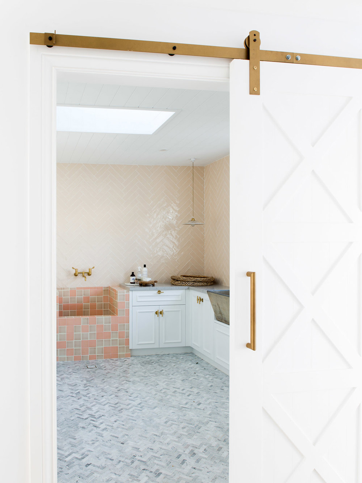 The sweetest surprise about this door isn’t that there’s a pink-tiled laundry room on the other side, but the understated glimmer of the track. The glamorous touch, courtesy of Three Birds Renovations, instantly lifts your spirits—and that’s a hard thing to do when you’ve got chores on the brain.