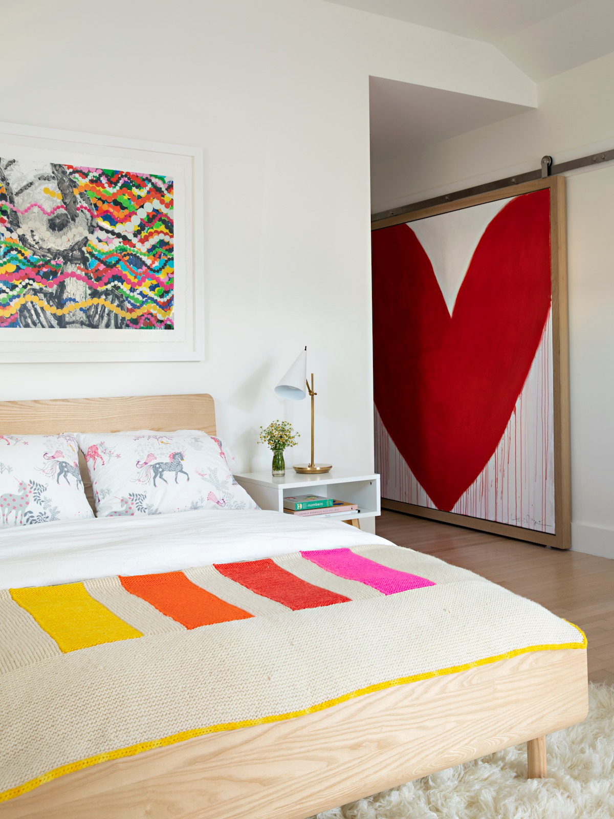 SoCal designer Raili Clasen tasked artist Kerri Rosenthal with painting one of her biggest canvases yet. The end goal? Display the giant heart in her client’s kids’ room. Clasen had the piece framed in wood and situated on a track, but it doesn’t have to be attached to the closet forever—it can be taken off its hinges if the family ever decides to move.