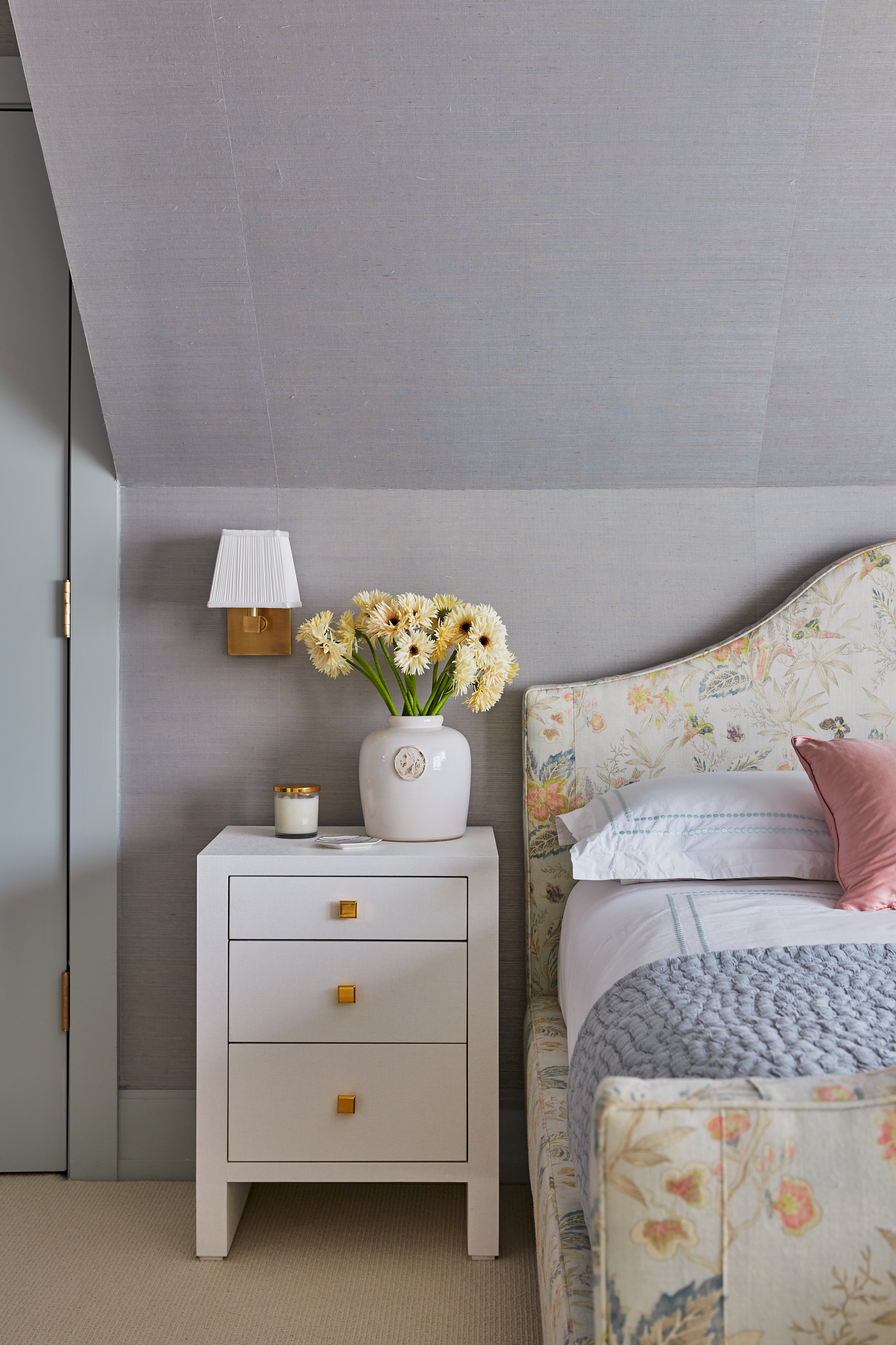 While the interior designer gravitated toward a sweet, botanical theme for eight-year-old Andree, she wanted to keep 10-year-old Eli’s room streamlined and sophisticated. Her first stop: Furnishings company LEE Industries. For Kraiem, working with a company that offers so many variations on size, shape, and style was a no-brainer. Since the third floor was tucked under sloped ceilings, Kraiem needed decor that could fit into the unusual dimensions. Not only was she able to create low-profile beds and chairs, but she was also able to change smaller aspects, like the stain of the furniture’s wood elements.