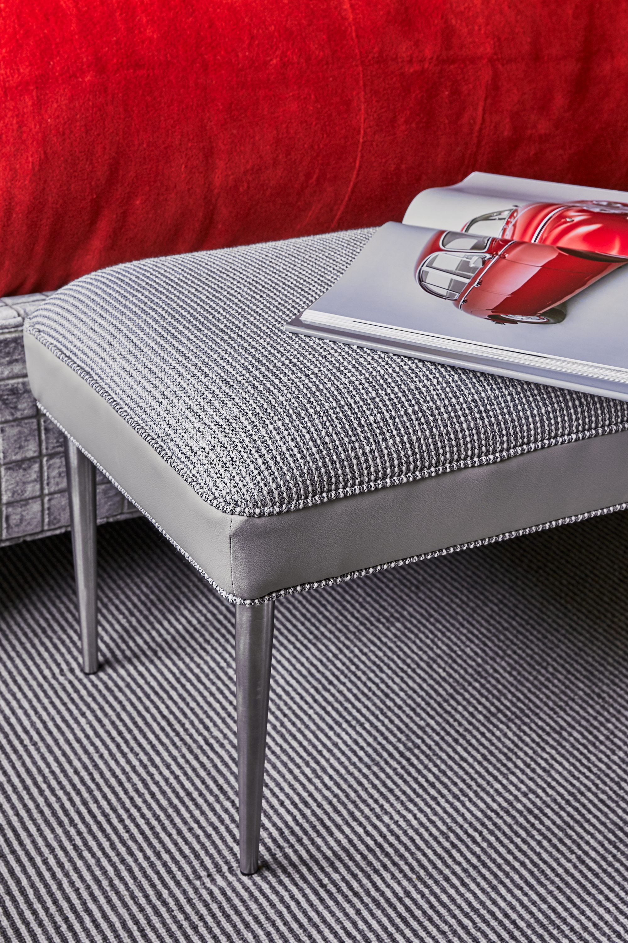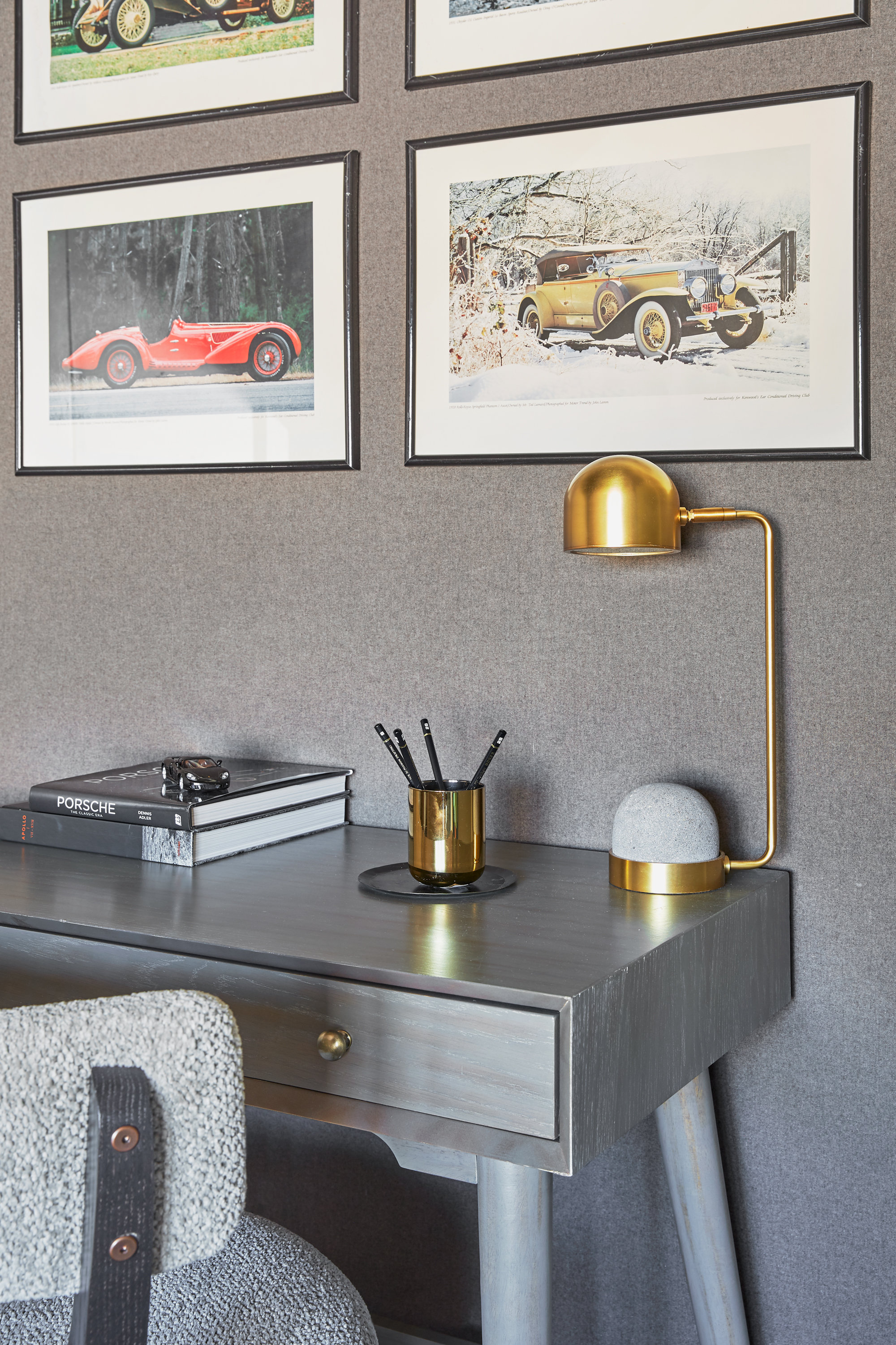 The customized pieces she placed in the Eli’s bedroom might be similar in proportion, but style-wise, they’re completely different. The designer stuck with solid red and gray fabrics, then personalized the legs of each addition—the bench got metal ones, the desk chair, a wood base with a deep ebony finish.