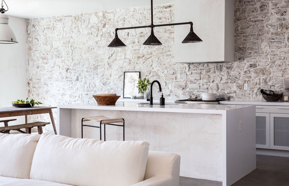 I usually only work on old houses, spaces where I find character and figure out how to keep it. The Rock the Block home I designed for HGTV was my first time doing new construction. The place was a blank shell, void of charm, so I knew I had to bring in the soul. It quickly became a case study. On the walls of the kitchen we used my go-to treatment for achieving texture: SureCrete. (I used this same concrete skim coat all over my old bathroom to disguise the ugly shower tiles.) Then to make the room feel a bit earthier, like it had been there forever, we added stone.