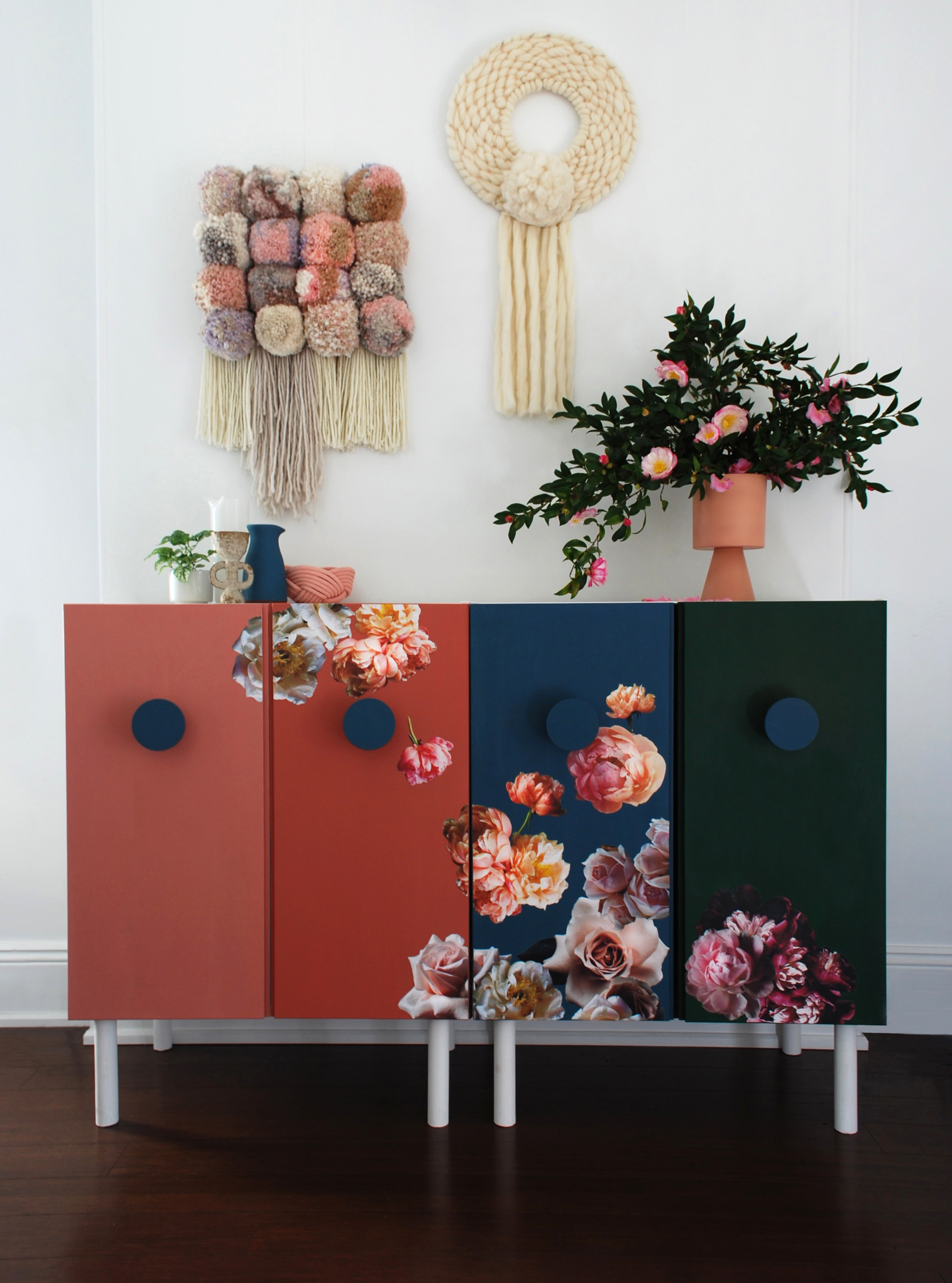 Don’t panic: You don’t need an art degree to create this detailed design. Blogger Lisa Tilse used chalk paint to color block her Ivar system and then went the decoupage route with photos of florals. Make the project even easier by sticking on the decals of your choice instead.