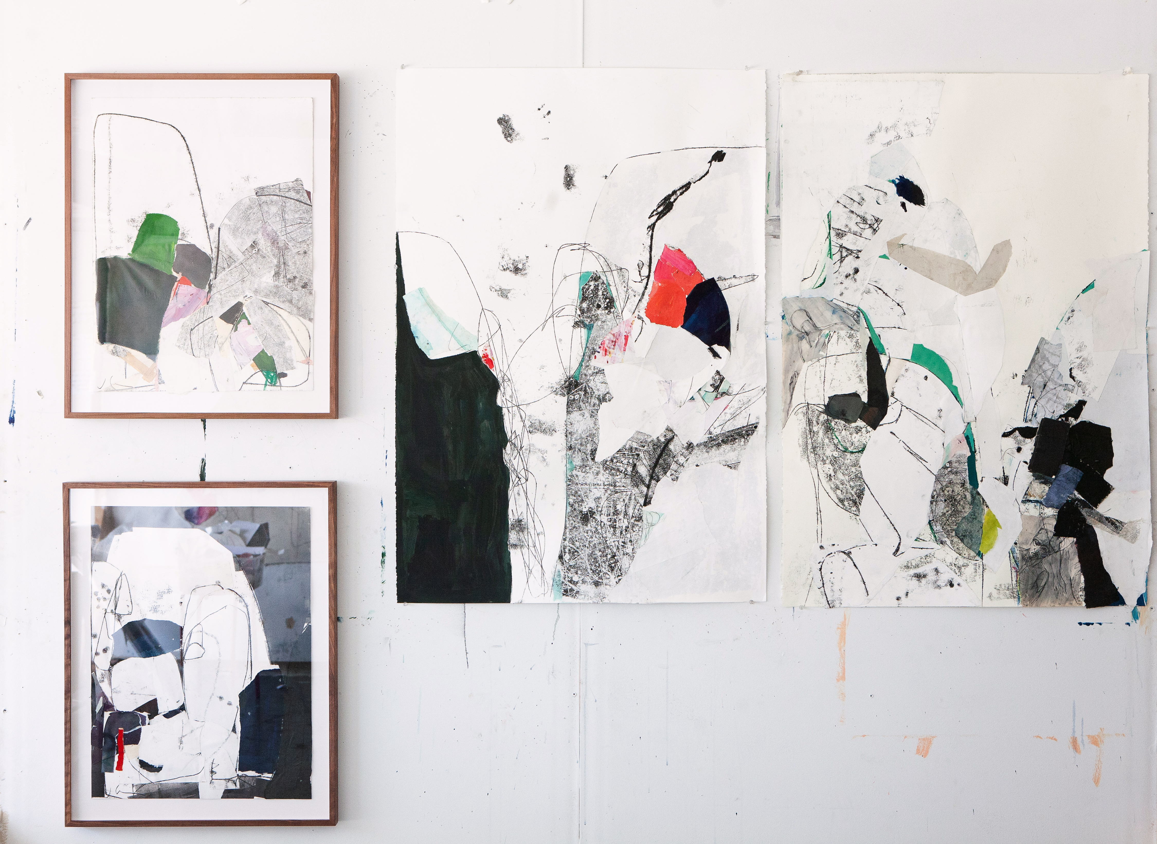 Often composed from traditional and nontraditional raw materials—including fragments from old projects—her mixed-media pieces and other works on paper range from small diptychs fit for a gallery wall to all-consuming canvases that span from the floor to the ceiling. Her pieces have become a go-to source for other west coast designers as well, including Emily Henderson, Melanie Burstin, and Stefani Stein.