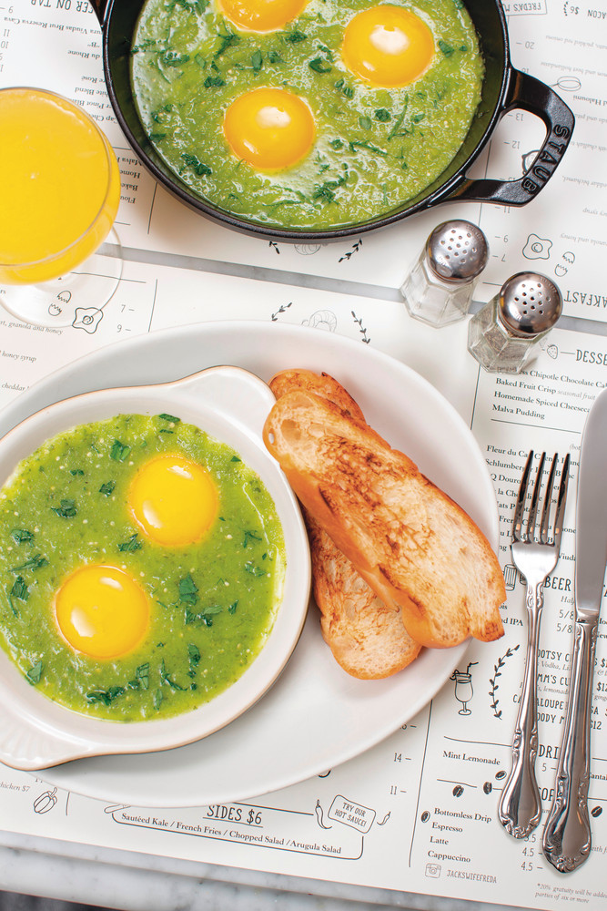 “People are used to shakshuka (shahk-SHOO-ka) being made with red tomato, but we use a green tomatillo for a more Latin American spin to the classic tomato sauce. Simply put, it’s a traditional Middle Eastern breakfast and lunch dish consisting of baked eggs and tomatoes. I was introduced to it in Israel when I was young. All the moms made it for their kids, and I would ask my mom to make it for me. It’s served everywhere in the Middle East, but I never thought it would be such a hit here. We serve it with toasted challah bread to make it original, and the doughiness of the challah is the perfect complement to the eggs and sauce.”