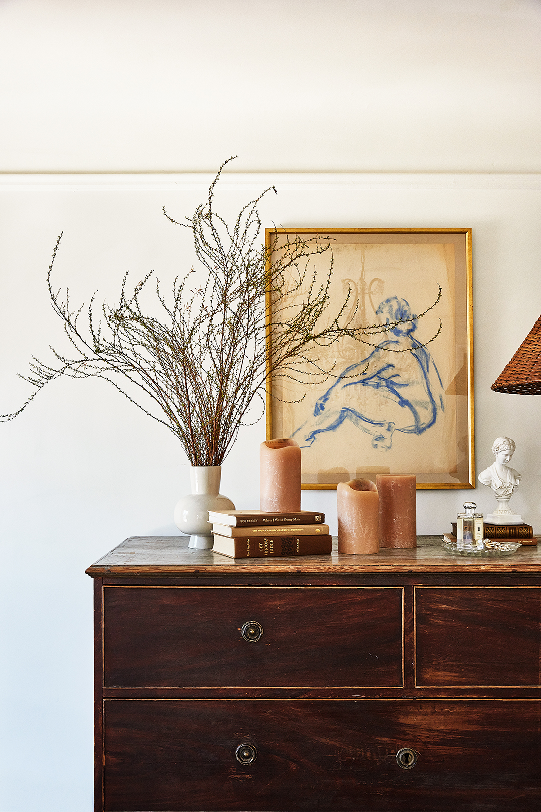For Brown, the home’s Mediterranean roots was the catalyst for trying on a more eclectic decor style. As she settled in with her best friend–turned–roommate, she found herself choosing vintage rugs and olive branches in favor of her usual trailing pothos vines and quippy-phrase posters. You could say the rental is where Brown’s tastes grew up—in part due to the pandemic but also thanks to the creative freedom. “I’ve had roommates before that were very involved in the design process, causing a lot of compromise,” she explains. “But this time I have total control.” (Just one perk of sharing your space with a pal who gets you.)