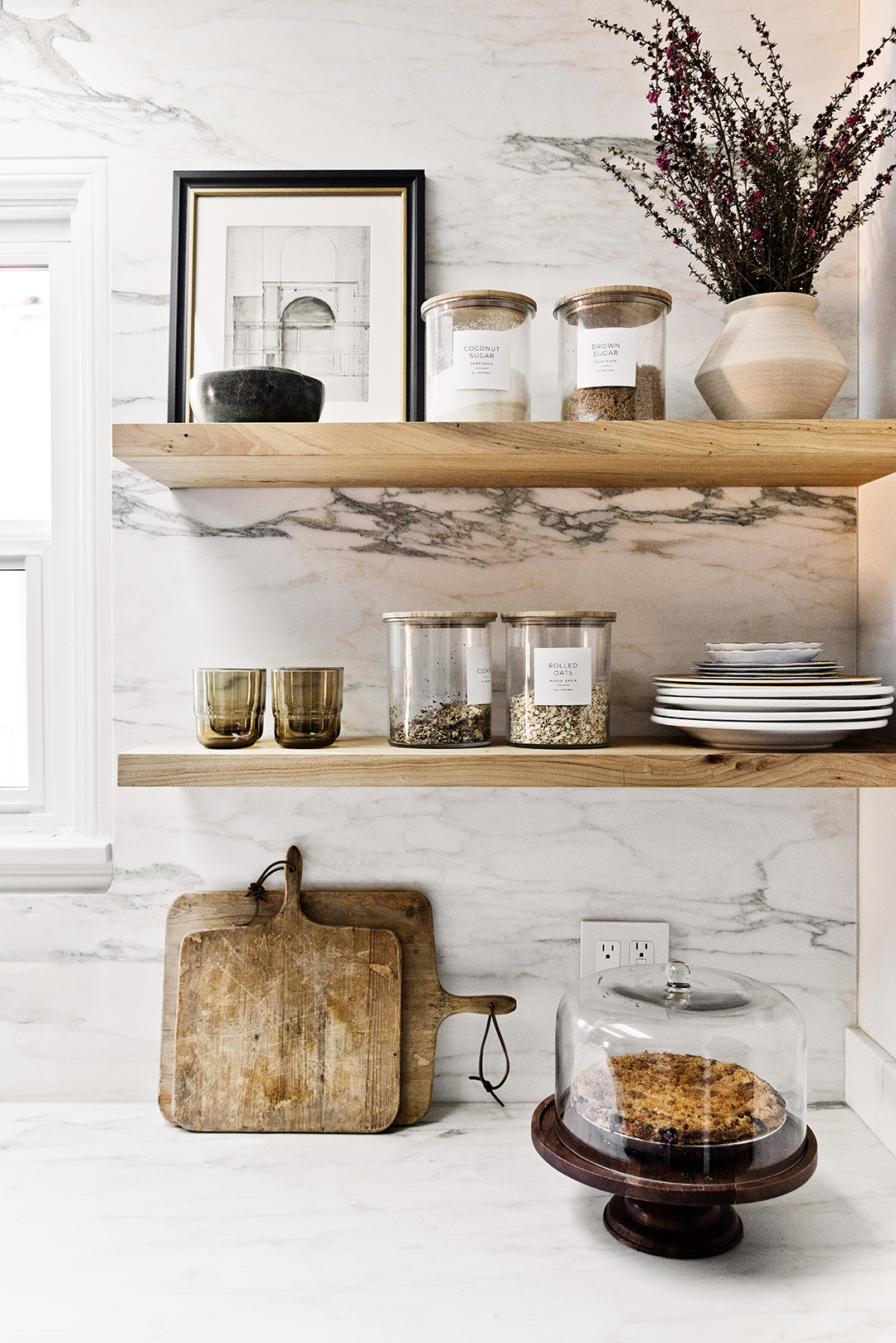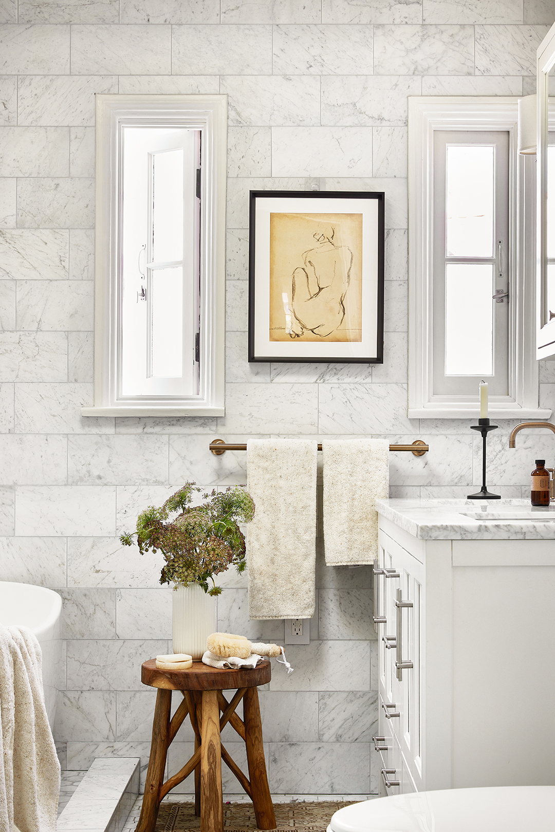 A vintage wood stool next to the bathtub makes setting down her latest read simple, and the open kitchen shelves got Brown’s signature styling treatment with decanted cooking essentials and rustic serving boards ready for a charcuterie spread.