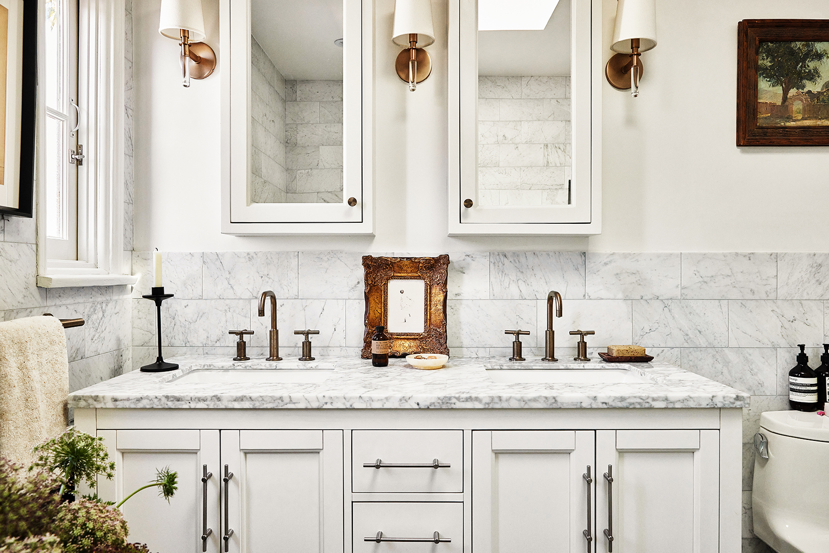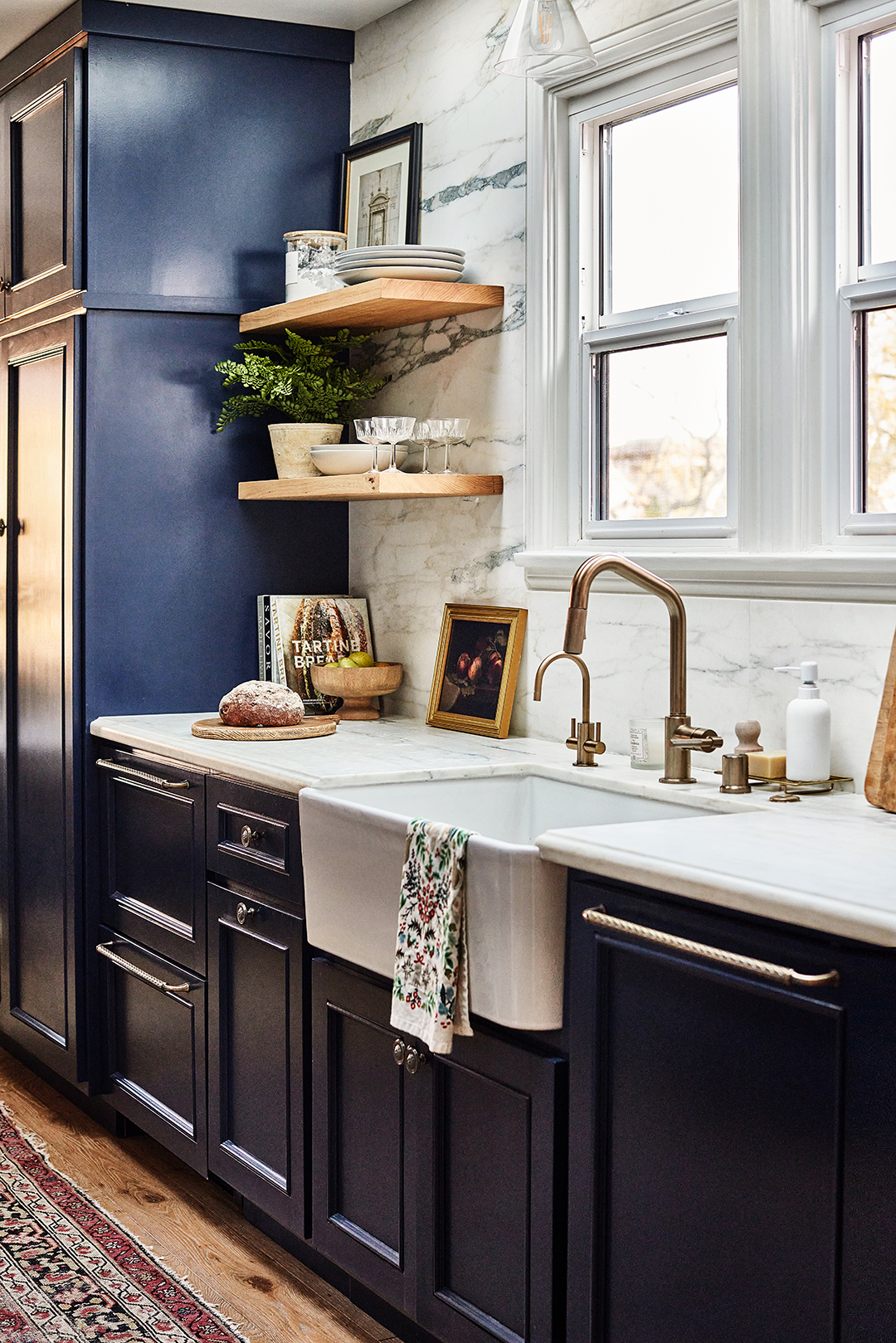 Despite the kitchen and bathroom already being in pristine condition—Cooper ensured there were plenty of cupboards to hide the ugly stuff (even a dedicated appliance cabinet), and there’s the added luxury of soft-close drawers—Brown brought in a few additions to make the spaces feel like her own, albeit temporarily.