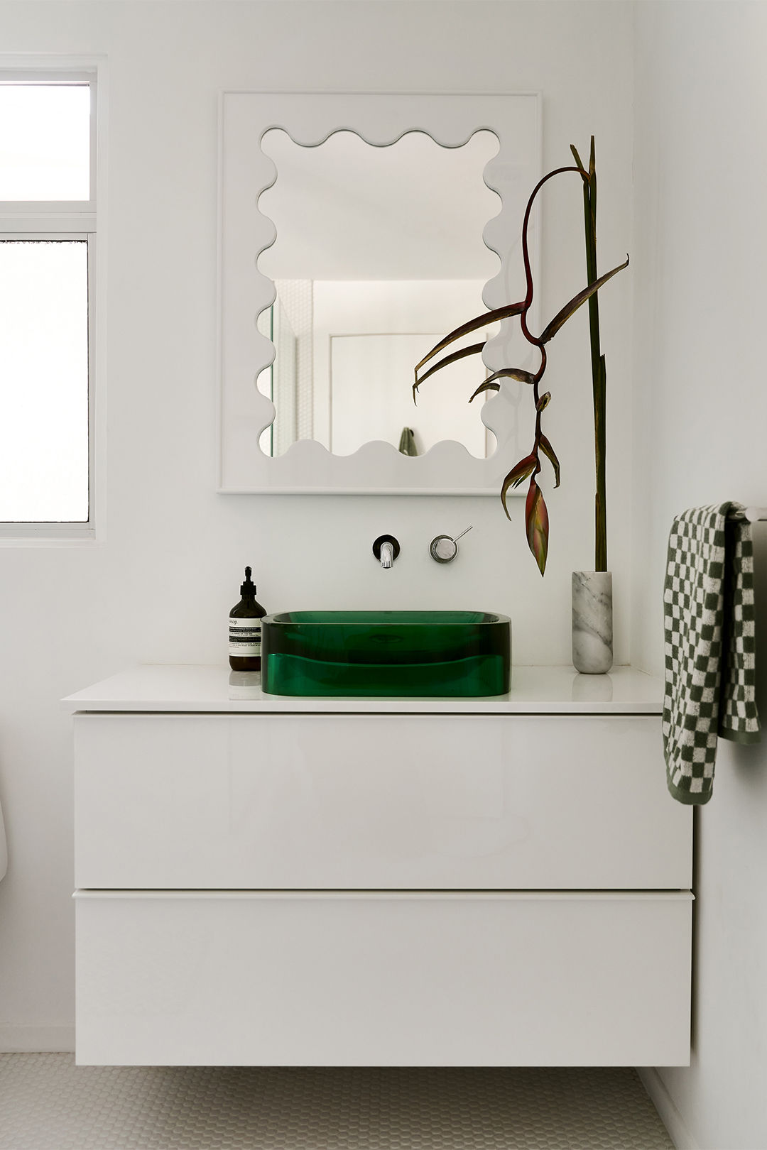 The biggest obstacle was designing the main bathroom from scratch. (When the pair bought the house, the space was a converted garage, so it didn’t have any windows or proper plumbing). With help from their contractor, they built fresh separating walls and ran new plumbing, which involved opening up the concrete driveway. In the guest area, however, things didn’t have to be so meticulously thought out. “I just got a green sink that I loved and went with it as the statement piece and worked around it,” shares Jen.