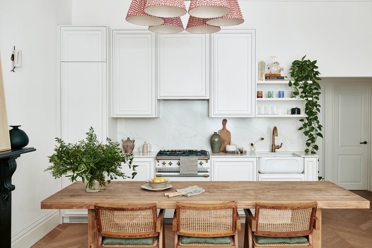 When the couple bought the three-story place from the previous owner, they had made a promise to honor the integrity of the architecture—well, really, De Gasperis wanted to accentuate it. She had an internal list of details she would not touch: the grand staircase, the original trim and molding (where salvageable), the fireplaces, and entry mirror. All the elements she added during the eight-month-long renovation—a DeVol-designed kitchen, floral William Morris wallpaper, unlacquered brass fixtures, oak herringbone flooring—preserved the patina of the almost-200-year-old house. “As I child, my parents purchased an old home in Toronto and renovated it themselves. I remember the literal blood, sweat, and tears they put into the project, and that was something I always craved in my adult life,” says the designer.