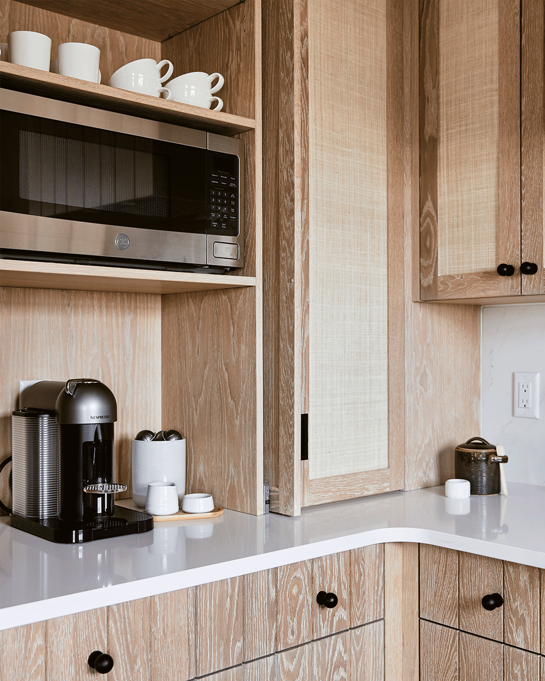 In the U-shaped cooking zone, the pair once again streamlined function with a panel-ready refrigerator, trash pull-out, dishwasher, and pocket hinge doors that disguise a coffee bar. “That way, there are no blind corners,” notes Bennert. The wax-finished white oak cabinets, similar to the floors, are blended with engineered wood so they won’t contort due to the climate.
