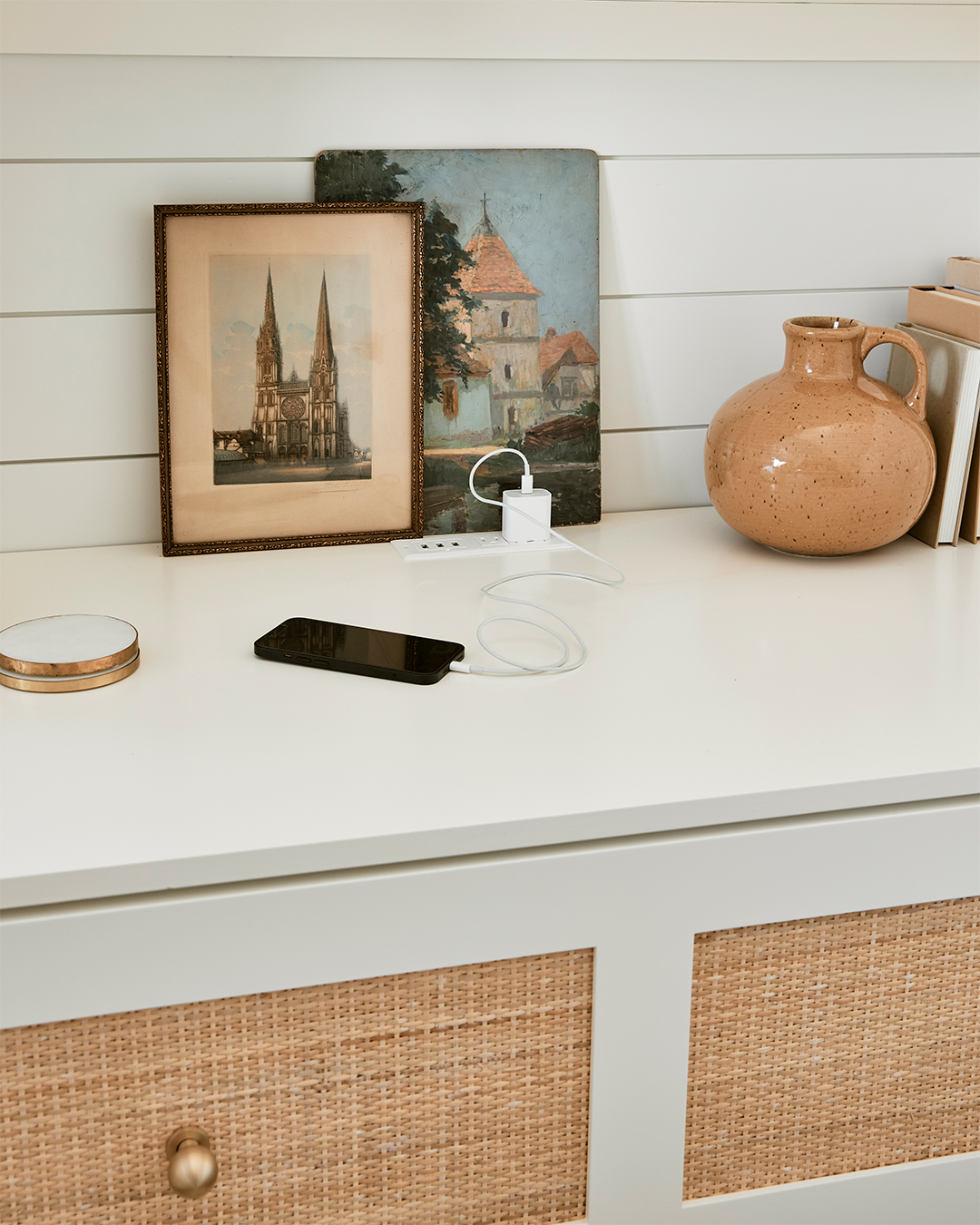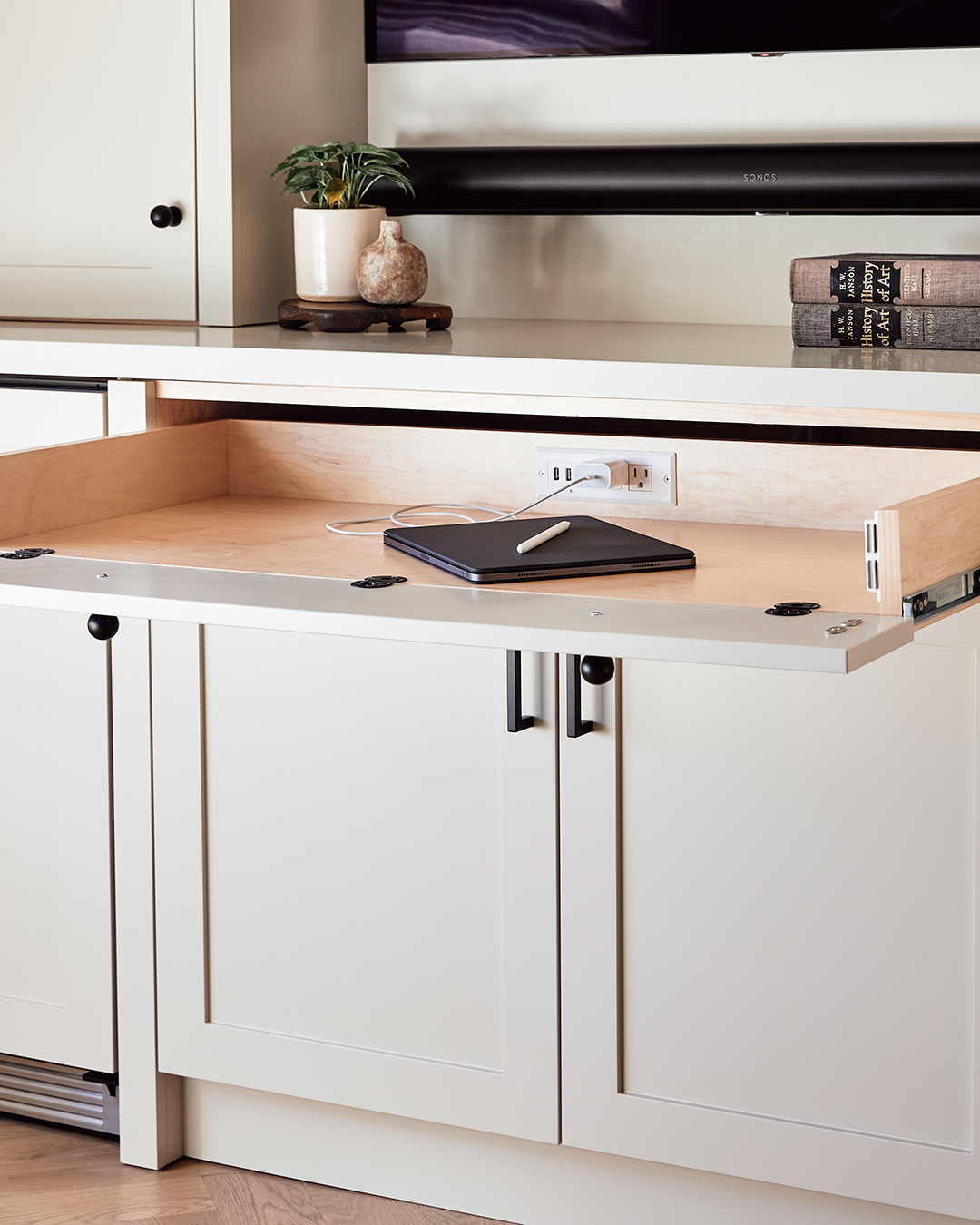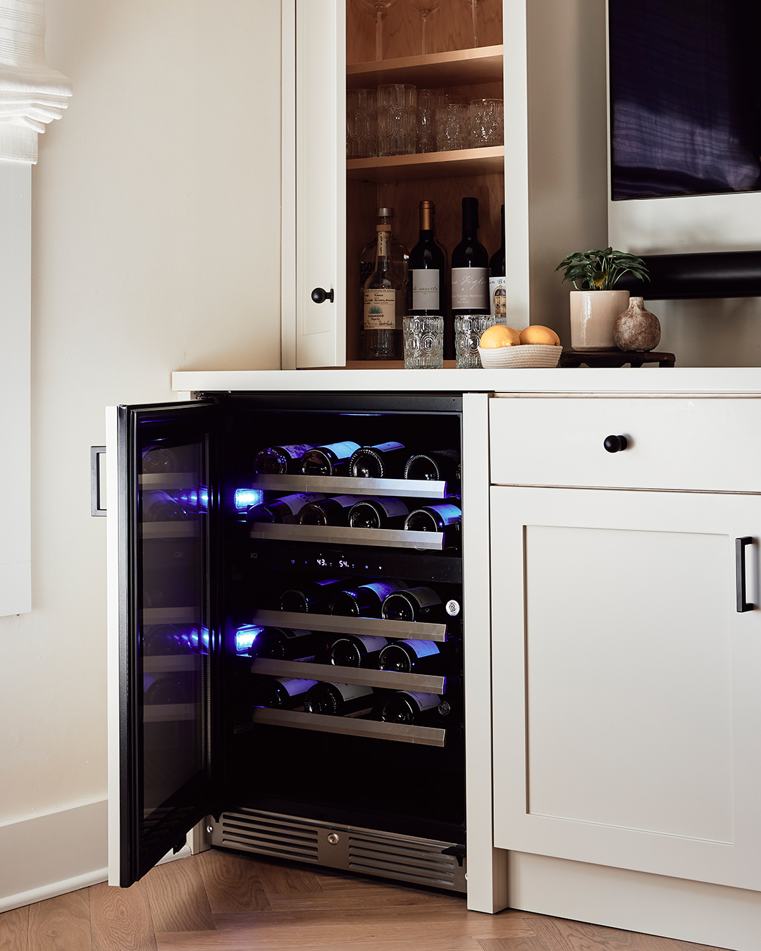 Lazzaro’s wood-savvy brother can be credited for the millwork throughout the home, including the built-in media center. The storage structure around the TV houses a wine fridge, a bar cabinet, and a pull-out desk (the front of the center drawer can flip down into a worktop). “We were designing it halfway through the pandemic, and the owners really wanted to have an extra place to work from home,” shares Bennert. The designers took a similar approach in the guest bedroom by tacking on a vanity to the new cane closet.